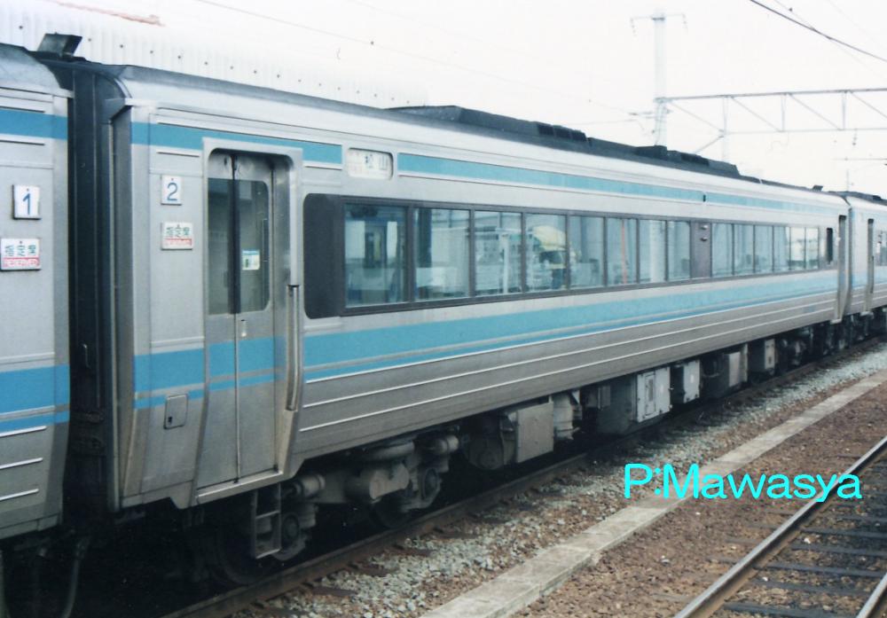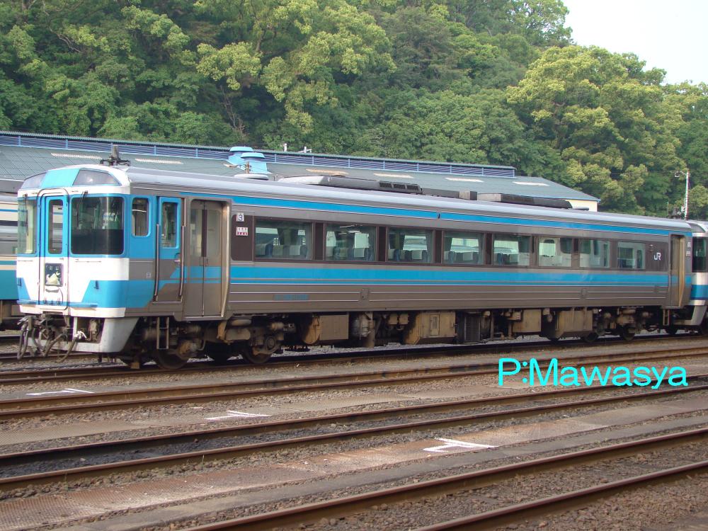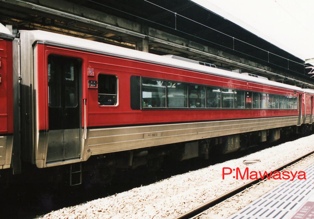 JR四国より移籍したキロハ186形式を平成4年に特急「あそ」、「ゆふ」用に普通車に改造したもので、平成4年に登場しました。客室内は仕切り壁をそのまま残し、普通室に格下げ。旧普通室は大型テーブルを撤去し、リクライニングシートに交換しました。種車はDMF13HS形式を1基搭載していましたが、これを2基搭載とし、冷房装置用の小型エンジンを撤去し、機関直結式に変更しています。