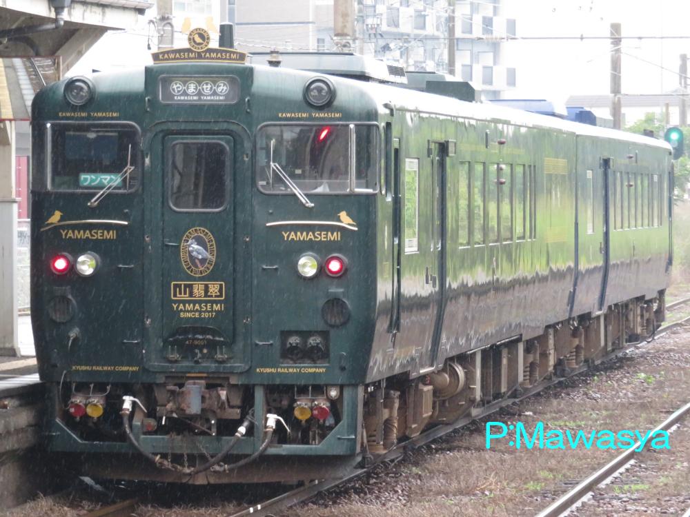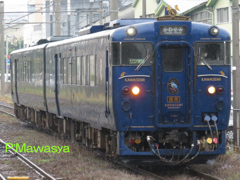種車はキハ47形式8000番代、9000番代です。1号車はキハ47形式8000番代で、「かわせみ」の愛称が付いています。前位側の乗降扉が撤去され、客室窓は固定窓に変更されています。車体色、座席のモケットは青色を基調としています。座席はリクライニングシート、カウンター席、子供用椅子、ボックス席、ソファー席があります。後位側には多目的トイレが設置されています。