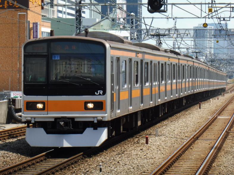 中央快速線に転属し、のびのびと軽快に走る209系1000番代。パンタグラフがシングルアーム式に変更されるなどの変化が見られます。