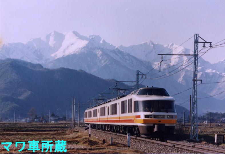 北アルプスバックに大糸線を走るパノラマエクスプレスアルプス。