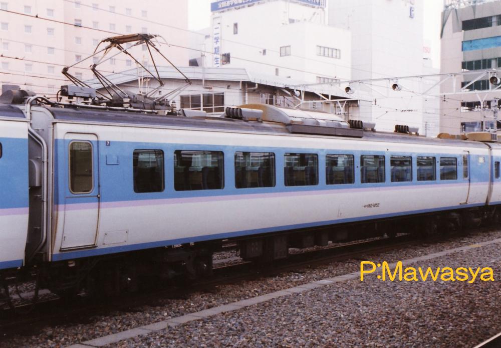 偶数、奇数向きどちらでも使える制御車。0番代に耐寒・耐雪構造を施したもので、前面は非貫通構造となりました。写真は中央本線の特急「あずさ」に使用されていた車輛で、通称「グレードアップあずさ」と呼ばれたアコモ改良車です。自由席は塗装変更のみでしたが、指定席車は客室窓を拡大する等の小規模な改造が施されました。塗装色は左側が初代、右が二代目となります。