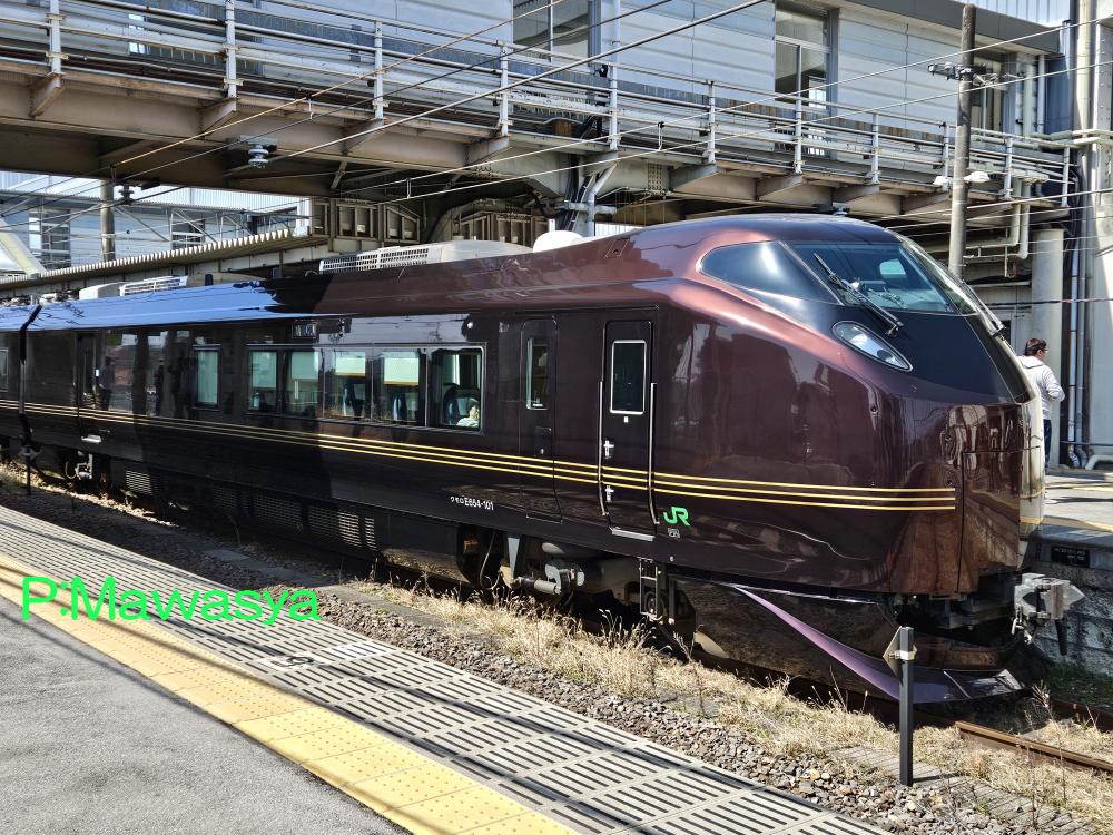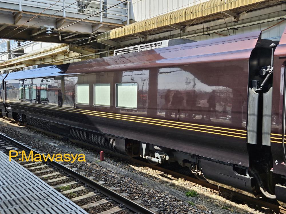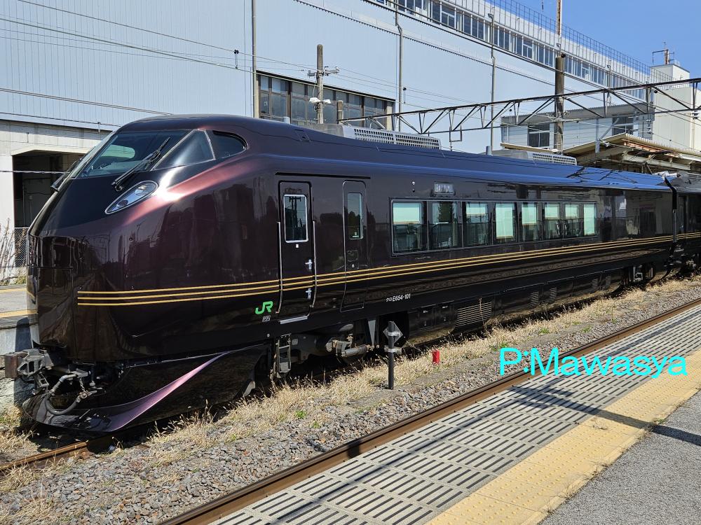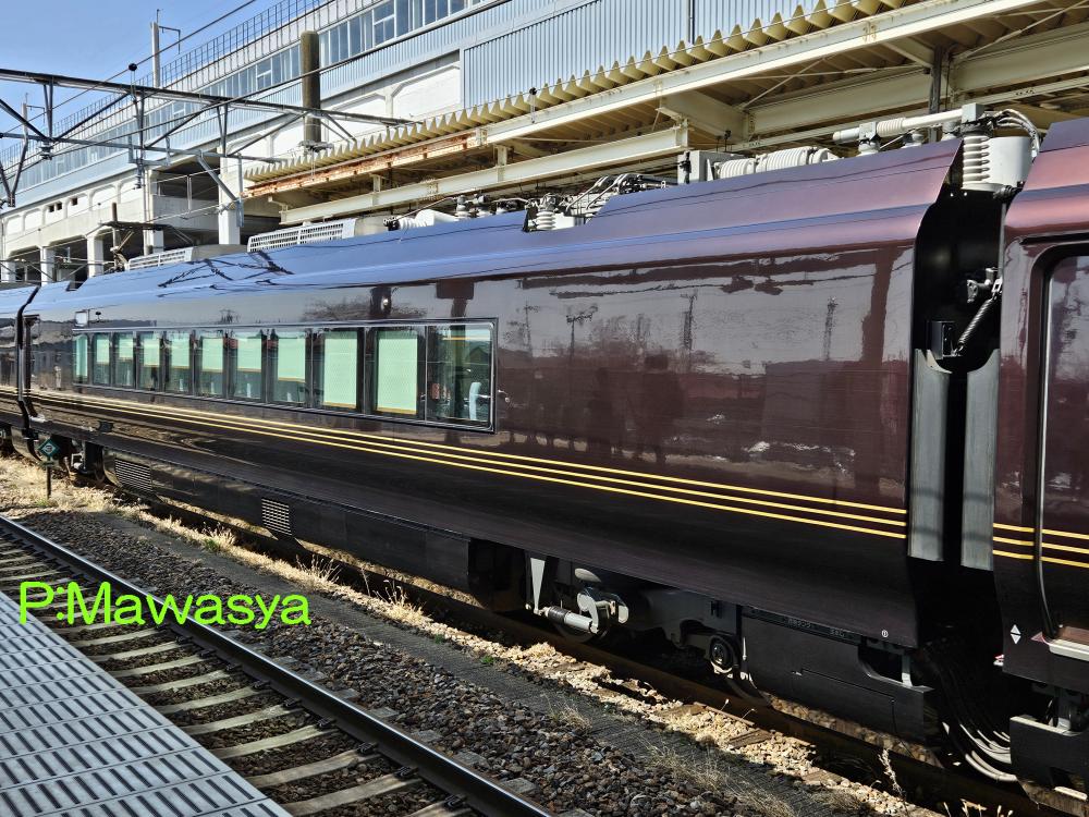 車体はアルミニウム合金製ダブルスキン構造で、基本的にはE653系等と共通です。台車を除いた床下機器類はカバーで覆われ、屋根部分も搭載機器を隠すカバーが設置されています。塗装色はお召し列車にも使用される事から、「漆色」が使われ、光線の当たり具合で褐色から紫色に色合いが変わるマジョーラ塗装が施されています。腰部に3本の金帯が巻かれています。