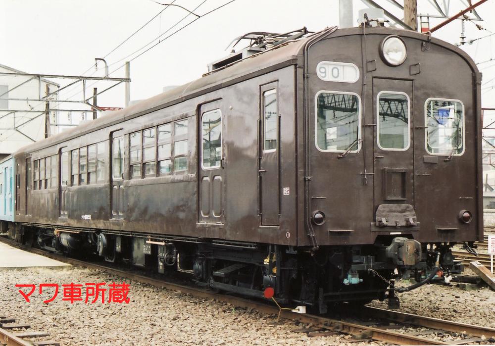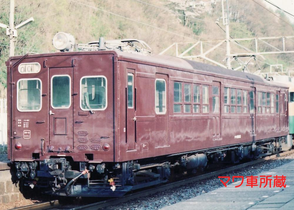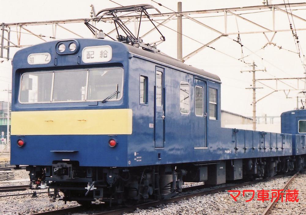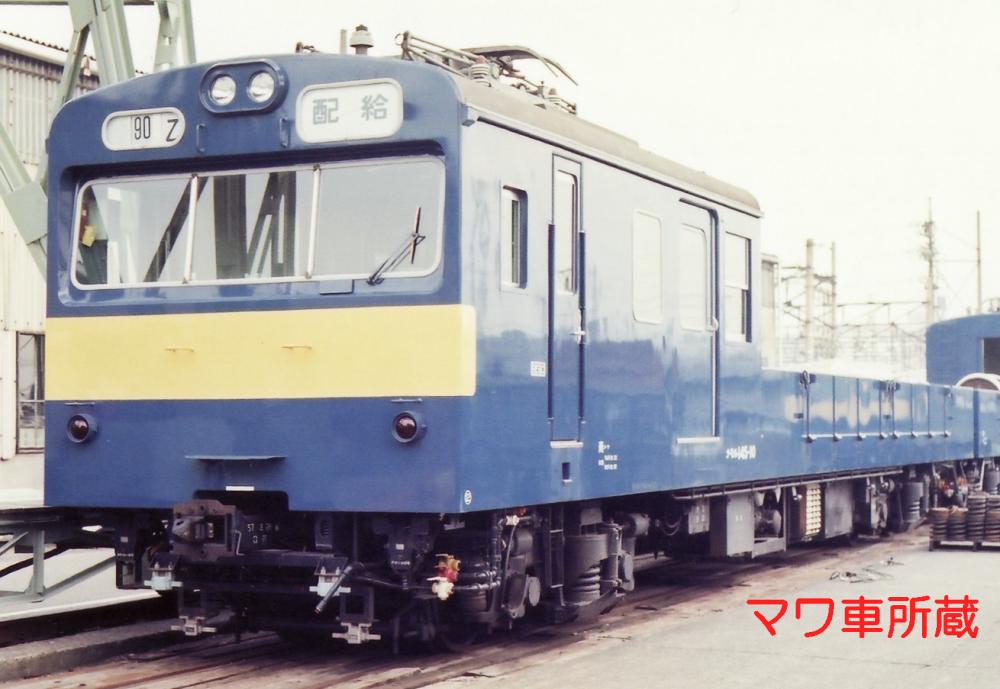昭和34年に登場した、17m級の両運転台を持つ配給車で、それ以前の木製配給車を置き換える為に登場しました。全車輛がクモハ11形式、クモニ13形式の改造によるもので、車体の中央部が無蓋となった凹形の特徴ある車輛となっています。雨に濡れては困る部品を運ぶ為に有蓋室が前位又は両側に設置されています。