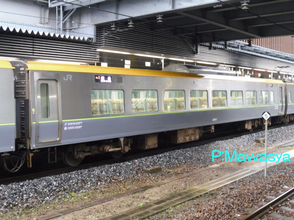 3両編成の松山方に位置するパンタグラフ付き制御車です。JR四国では初となるシングルアーム式パンタグラフを採用しています。電動空気圧縮機、SIV装置を搭載しています。普通席とグリーン席の合造車で、仕切り壁に荷物置き場があります。後位側には車いす対応の座席、トイレ、多目的室があり、乗降扉は他より間口が大きい。この他に洗面台、ユーティリティースペース(立席利用者の為にカウンターとコンセントを設けた場所。)があります。