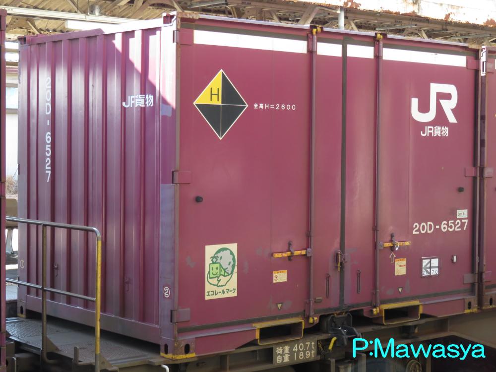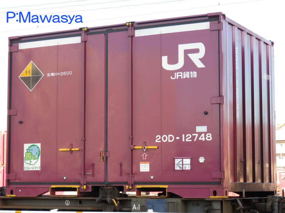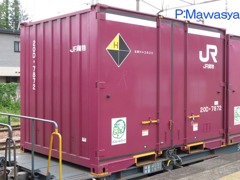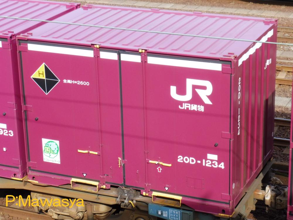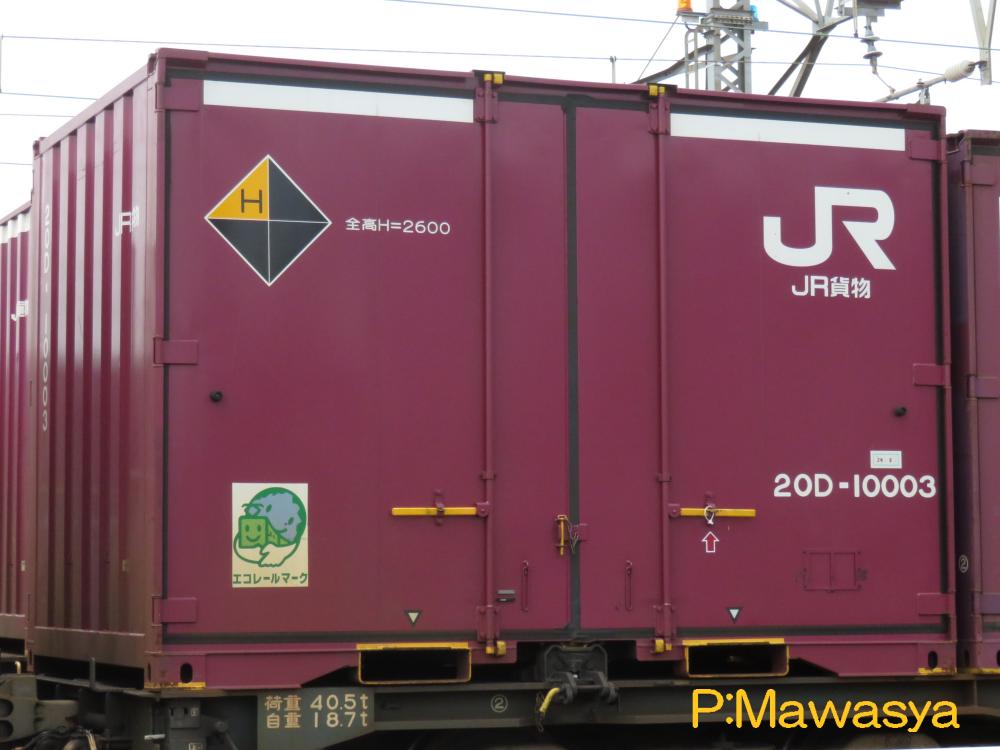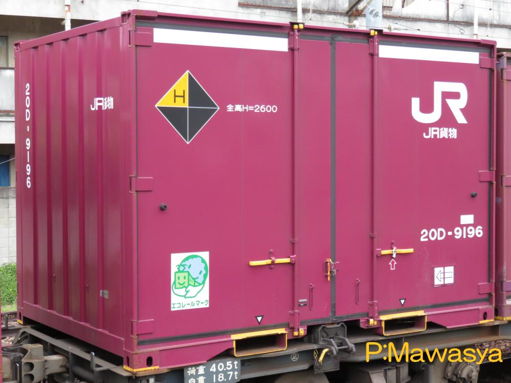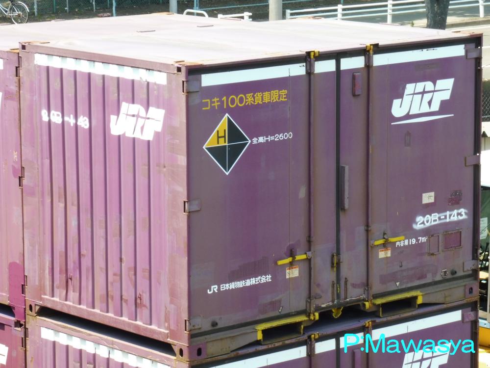 コンテナの上部を背高コンテナを示す白帯が配置され、側面には「コキ100系貨車限定」、ハローマークが添付されています。コキ100系限定ですが、特例区間においてはコキ50000形式による輸送も行われていました。