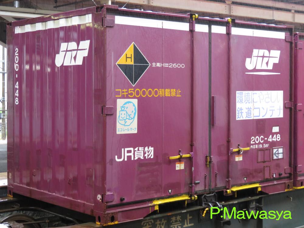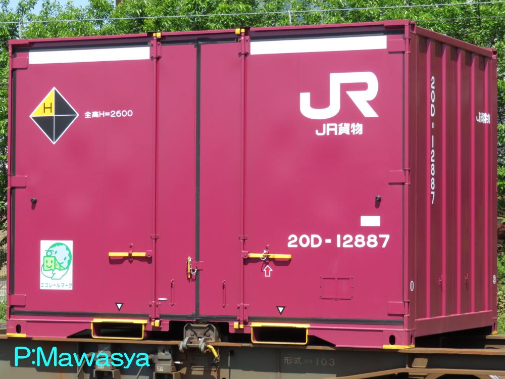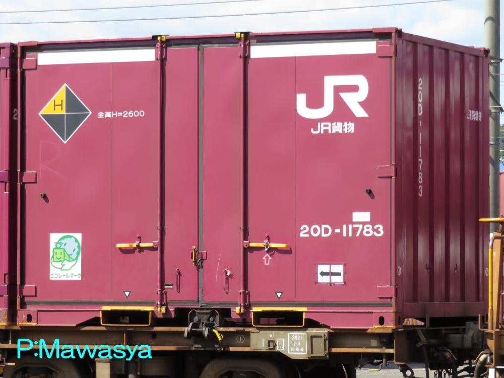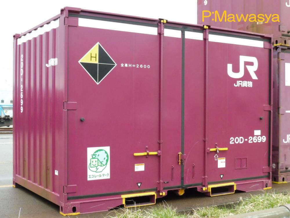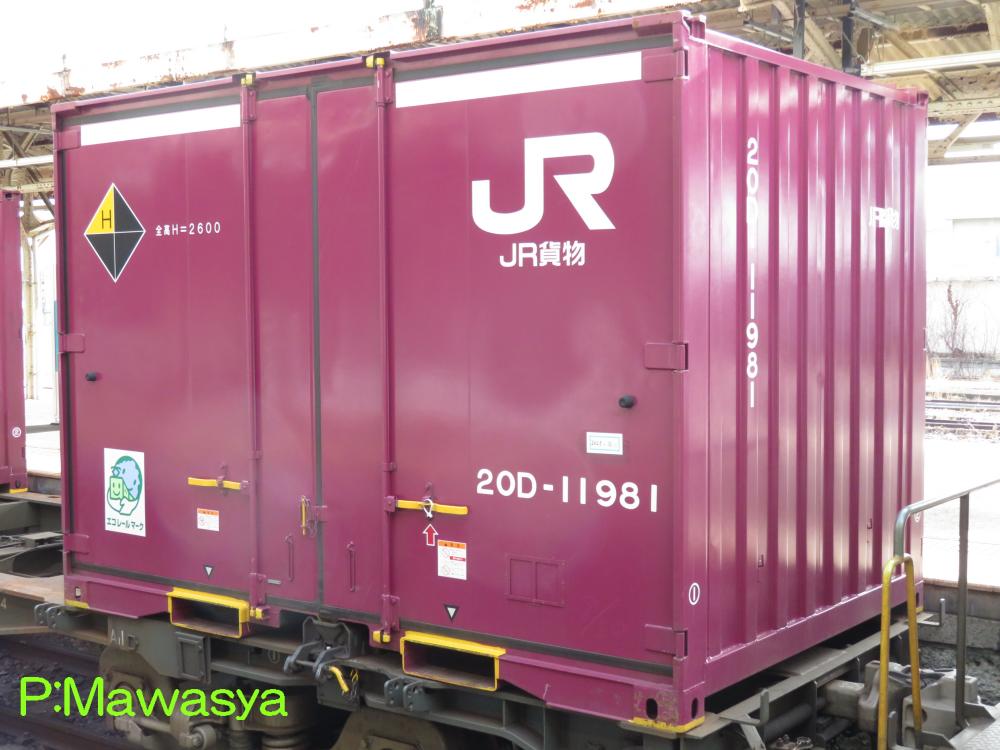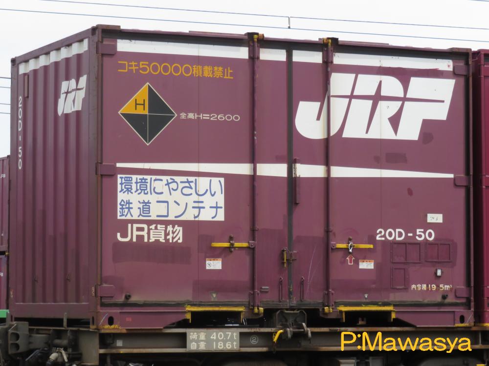 コンテナの上部を背高コンテナを示す白帯が配置され、側面には「コキ100系貨車限定」、ハローマークが添付されています。コキ100系限定ですが、特例区間においてはコキ50000形式による輸送も行われていました。