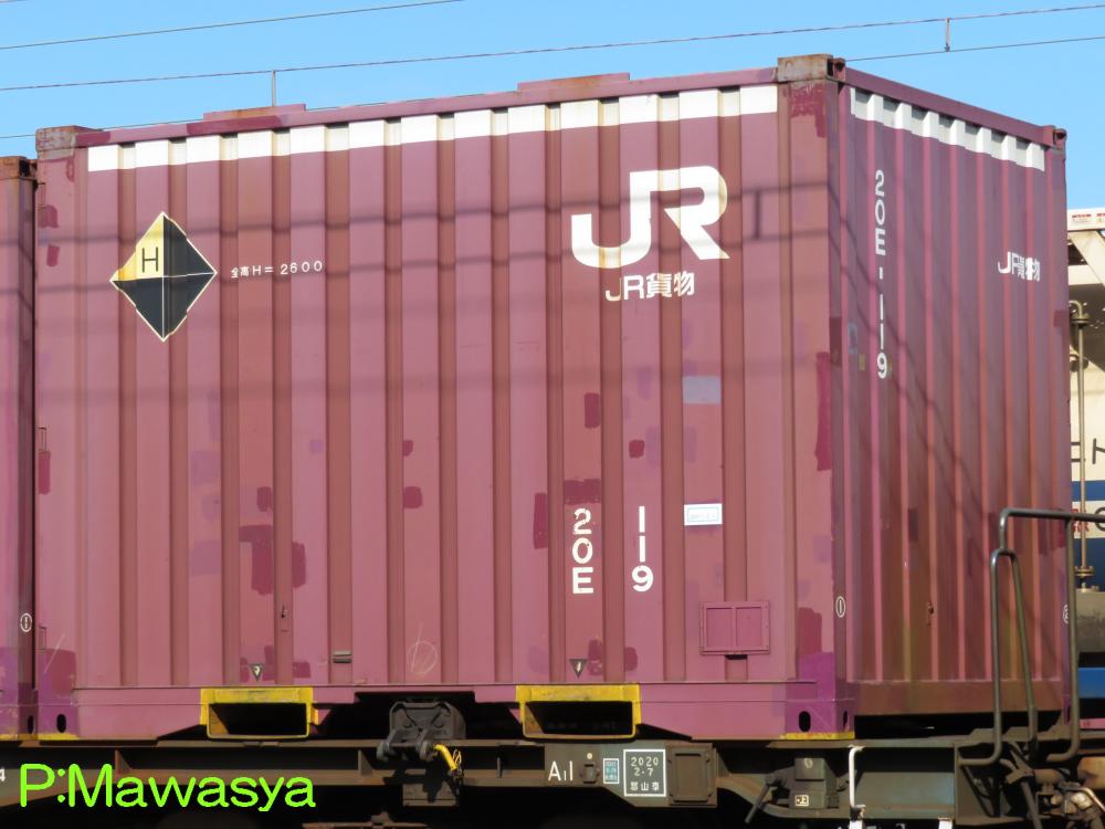 本形式では初めての総合製です。外観は20E形式とそっくりですが、妻リブが1本多く、8本になっています。標差しや戸当たりゴムなどはCIMC製に似ていますが、後位妻部の扉のヒンジの数は2つと異なっています。