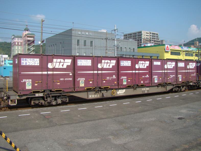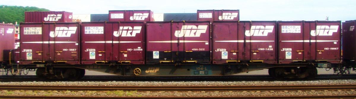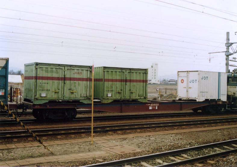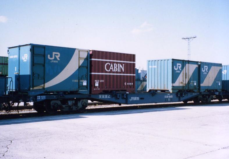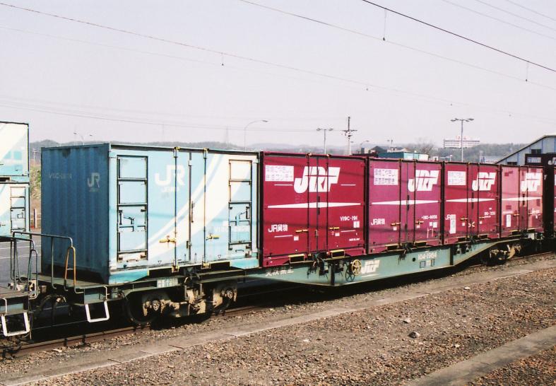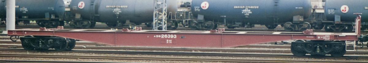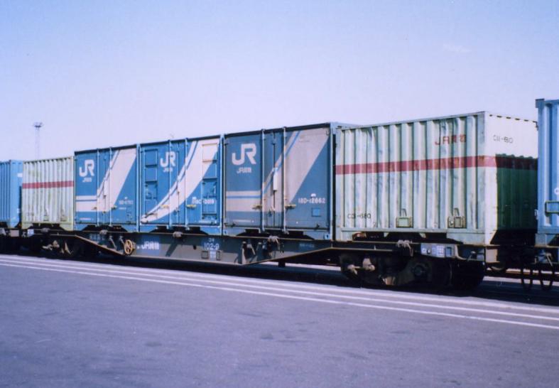 平成8年に登場した試作車で1両のみ製作されました。コキ100系を使用した海上コンテナ輸送は好調であるものの、大型重量コンテナやクンロクコンテナと呼ばれる9ft6inの背高コンテナには対応出来ませんでした。そこで、これらのコンテナ輸送にも対応できる車輛として、当形式が製作されました。