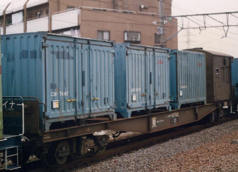 フレートライナーの多様化するコンテナ輸送に対応するために国鉄では初めての10ft5tコンテナ、20ftコンテナを積載可能とした形式で、昭和44年に登場しました。