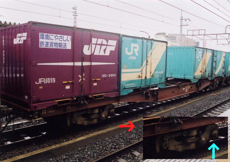 JR貨物発足後より使用している台車の亀裂が多発し、平成5年に羽越本線で台車枠破壊が原因となる脱線事故が発生してしまいました。全車輛を対象に対策を講じたTR223F形式に交換が行われました。識別のため、また亀裂などの異常を見つけ易いように台車枠は灰色に塗装されています。