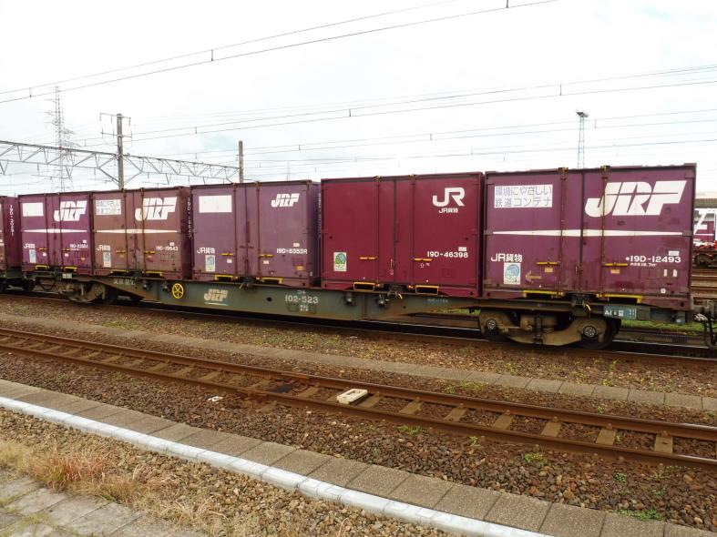コキ100系シリーズ第2弾となるグループで、平成元年に登場しました。コキ100形式、コキ101の4両1ユニットや車体長や積載設備には変化はありませんが、ブレーキ装置の変更が行われています。本形式はコキ100形式に相当する中間車ですが、コキ101形式に装備されていた電磁弁を本形式の奇数番号車に集約しています。(偶数番号車はCL方式のまま。)写真は初期の頃に見られたもので、JR貨物の文字が入っていました。その後「JRF」のCI(コーポレートアイデンティティー)に変化し、平成29年以降は省略され、JRFマークの付いた車輛も消去が進んでいます。