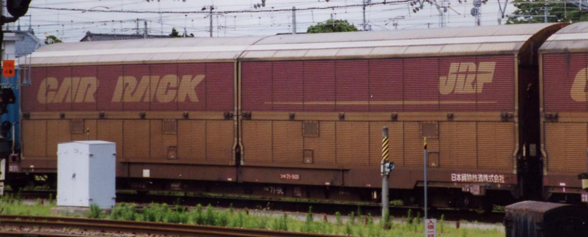 鉄道による乗用車の輸送は国鉄時代は車運車を用いて対応し、輸送の高速化、自動車の汚損防止などを目的に国鉄末期から専用のコンテナが開発されました。いずれも復路が空荷としなければならない欠点があり、解決されずにいました。この問題を低床式多目的車輛として試作されたコキ70形式をベースに、低床化で生じた大きな積載空間を活用して、往路は乗用車、復路は12ft5tコンテナを輸送できる「カーラックシステム」を開発しました。このシステムに使用されるのが平成6年に登場したコキ71形式です。試作車2両、量産車6両が製作されました。