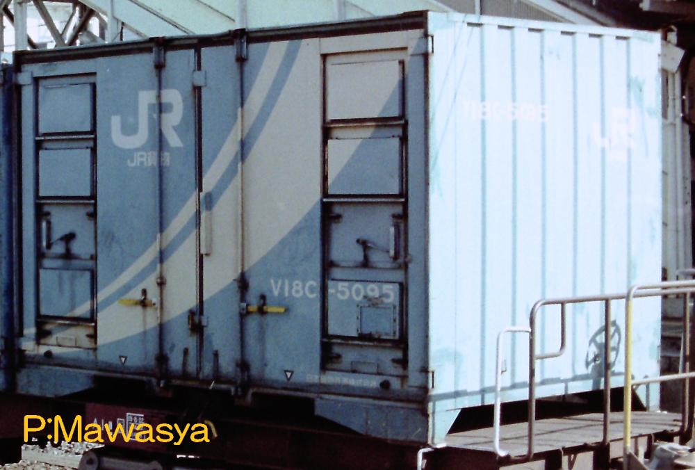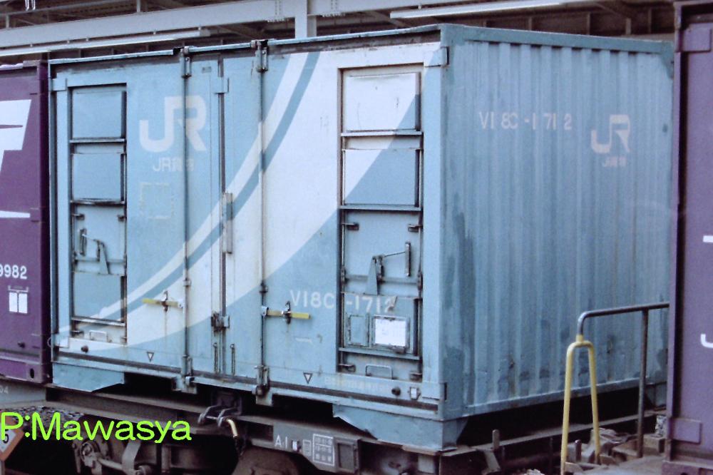平成2年に登場した通風コンテナで、5400個製作されました。トラック上で荷役が出来、人気を博した18D形式と同じ、側面二方開きとしたコンテナです。塗装はV18B形式と同じ、コンテナブルーの青22号をベースに風をイメージしたほうき星の尾っぽのデザインとなっていますが、両開きである事から細い帯を追加しています。1712番は東急製、5045番は日本車輌製で、妻面のリブの数が異なっています。