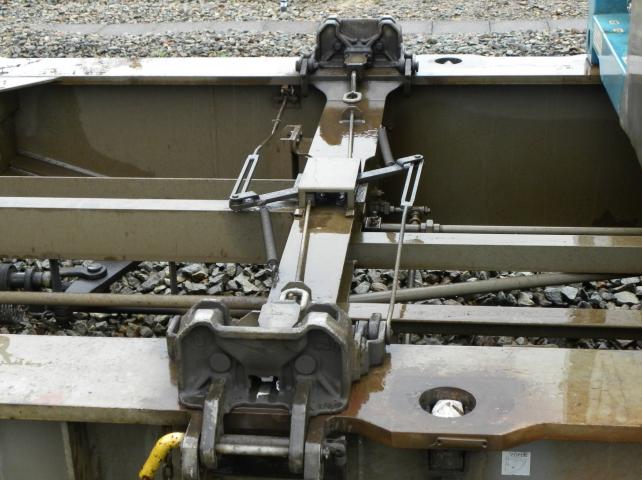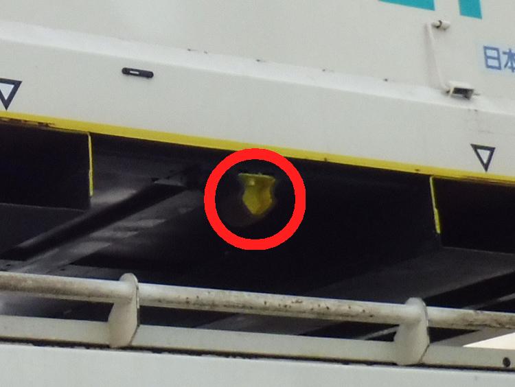 話が逸れてしまいますが、12ftコンテナの緊締方式を見てみましょう。コンテナの下部、底面中央(フォークポケットの中間)に矢印形の突起物があります。(写真左)受け側となるコンテナ車やトラックには緊締装置が設置されています。(写真右)