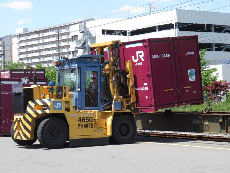 フォークリフトによる荷役方式はわが国独自のもので、コンテナ輸送を導入する際に線路幅が狭軌である事や使い勝手の良さ等を考えた結果、海外標準では最小の10ftでは小さいので、やや大きめの11ft(後に12ft)という独自サイズを採用した事により、フォークリフトによる荷役方式が誕生しました。