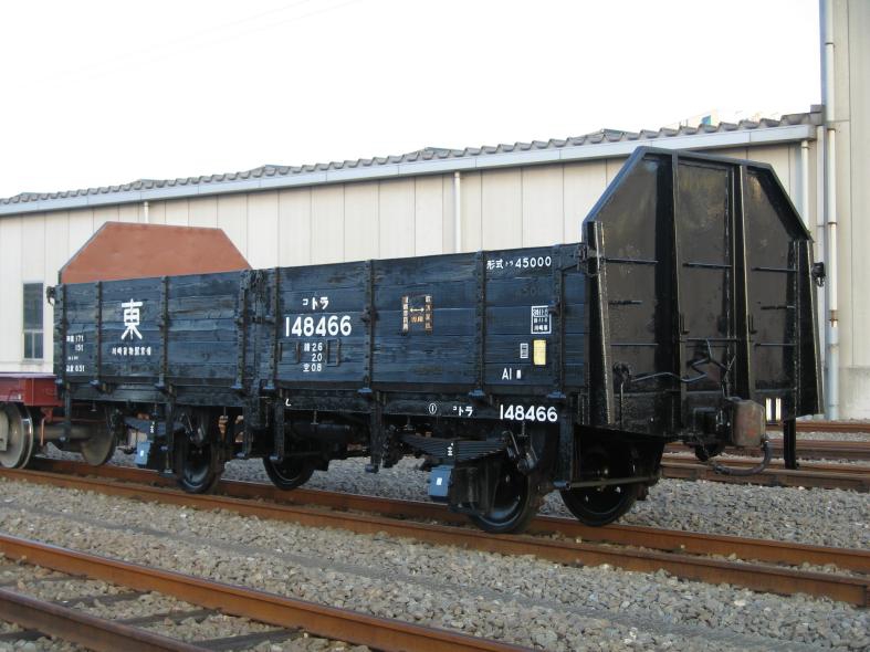 昭和35年に戦前製の老朽化した無蓋車を置き換えるために8184両が製作されました。荷重は17t積みですが、嵩高(かさたか)貨物の積載時は15t積みとする、特殊記号「コ」が付く「コトラ」(汎用無蓋車)です。