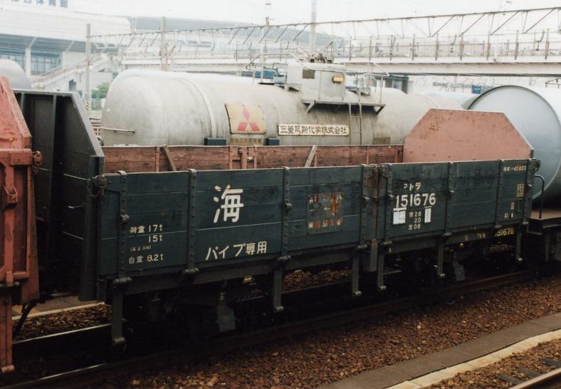汎用無蓋車として全国で活躍。JRへ移行後は写真右の輸入工業塩の容器輸送に活躍。塩だけに腐食が激しいため、あおり戸を平板に交換した車輛もありました。旅客会社でもトロッコ車輛に改造され活躍。平成30年にJR九州に所属していた1両が廃車となり、形式消滅しています。