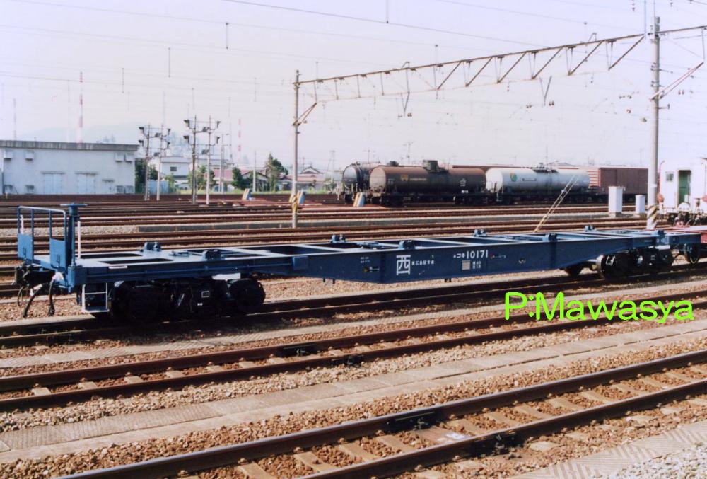 外観は長物車と同じく、フラットな床面を持つ貨車で、「コンテナ」を運ぶ目的の貨車を言います。当初は長物車として扱われましたが、昭和41年より独立して、コンテナ車という種類に分類されました。記号は「コンテナ」の頭文字「コ」です。