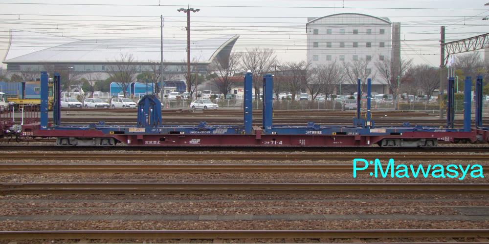 車体やシステムはコキ70形式がベースで、2両1組で、相互の連結は半永久連結器が使用されています。乗用車の汚損防止の為、車体の中央で分割するウイングトップ式のアルミ製ラックカバーを装備しており、その中に専用のUM20A30000番代を2個積載しています。往路はこのコンテナ1台に乗用車を4台又は5台積載します。復路は自動車の積載装置を床面に下げ、12ft5tコンテナを2個積載する仕組みとなっています。