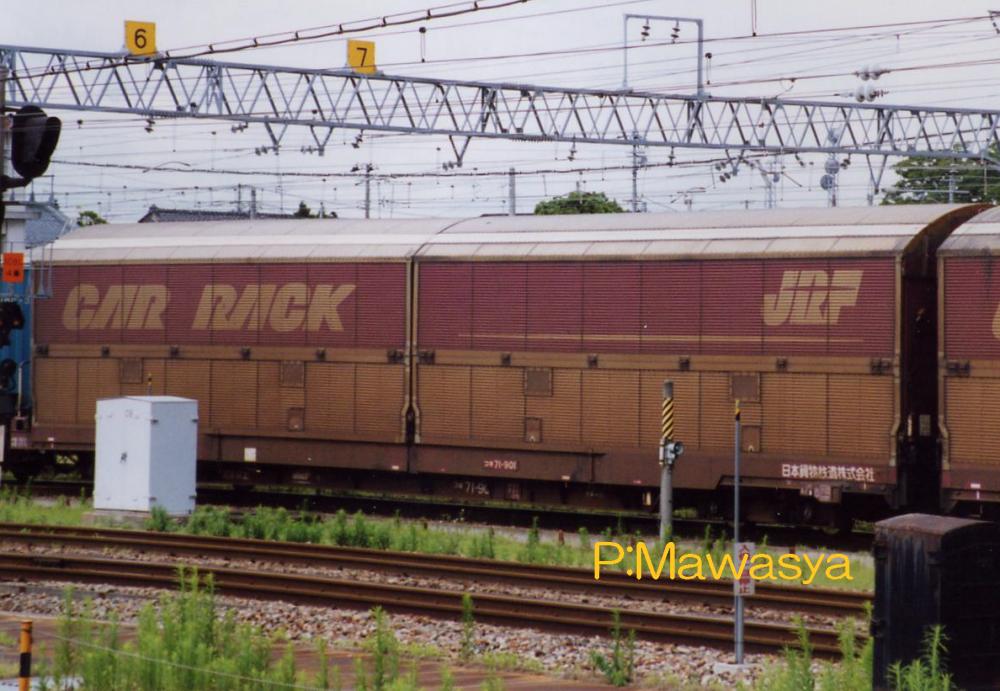 この問題を低床式多目的貨車(コンテナ車)として開発されたコキ70形式の設計思想をベースに低床化で生じた広い積載空間を活用し、往路は自動車、復路は12ft5tコンテナを輸送する「カーラックシステム」を開発し、平成6年に専用車輛としてコキ71形式が登場しました。試作車2両、量産車6両の計8両製作されました平成8年に貨車として初めて、鉄道友の会よりローレル賞を受賞しています。。