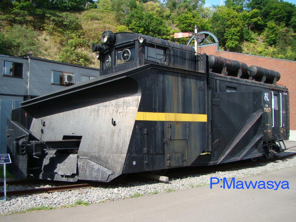 ラッセル式雪かき車とは、機関車に押される形で走行し、くさび形になった先頭部で雪をすくい上げ、左右に付いた翼ではね飛ばして除雪をする方式の車輛です。機関車の前に連結される為、前位側には運転台に見える操作室があり、前部標識灯や前面窓を備える。操作室では左右に付いた翼を操作します。前方に何もなければ翼を広げ、ホームや踏切など支障物があれば翼を畳むといった感じです。翼のある部分、後位側は機械室で屋根には圧縮空気を溜めるタンクを6基備えています。