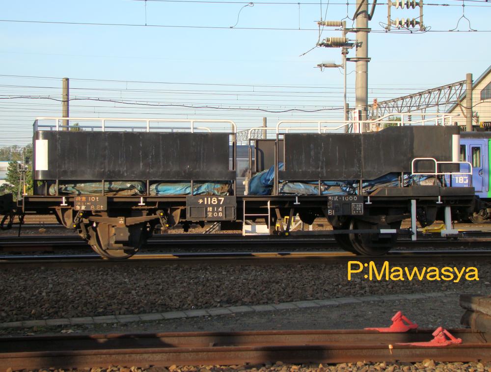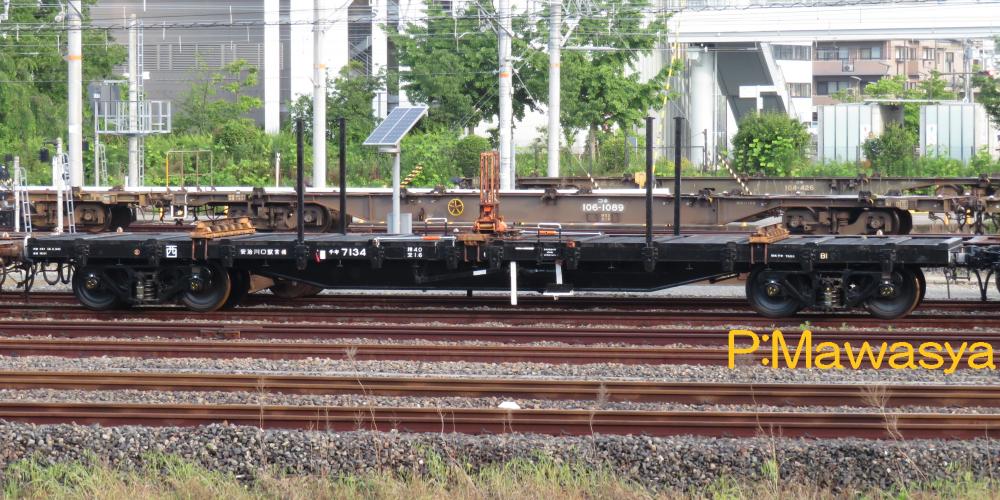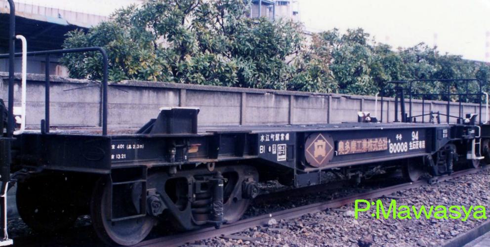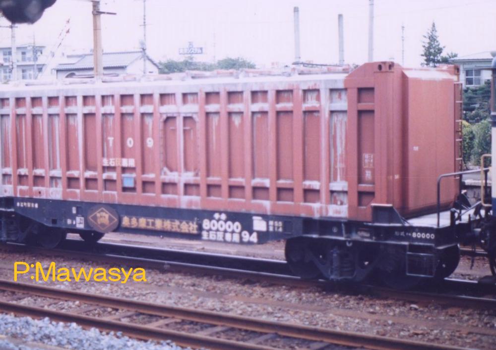 昭和51年に44両製作された生石灰専用のコンテナを輸送する私有長物車です。ホッパ車で生石灰を輸送していましたが、製鉄所の移転に伴い、最寄り駅まで鉄道、そこから自動車で輸送する方法になった為、本形式が登場しました。