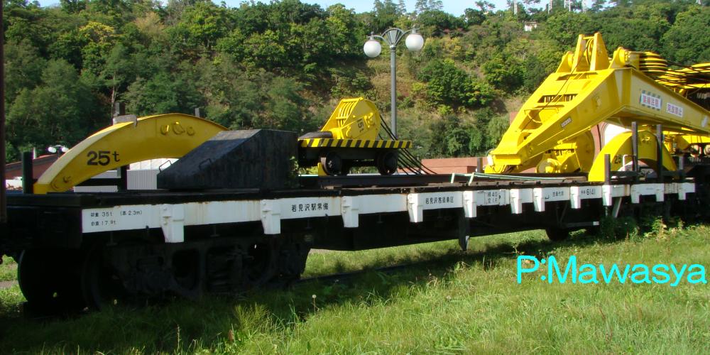 嵩高貨物を輸送する際の荷役用ロープ掛けは設置されていますが、他の長物車に見られる柵柱受け等は省略されています。もう一つの役目である「遊車」ですが、長物車に載せる長尺物が車長より長い場合、隣り合う貨車との接触による荷崩れや曲線通過時に車輛接触限界を超えた場合、構造物に接触する恐れがあります。これらを防ぐ目的で、前後に配置する貨車(長物車)を言います。遊んでいるようで、実は重要な役割を果たしているのです。