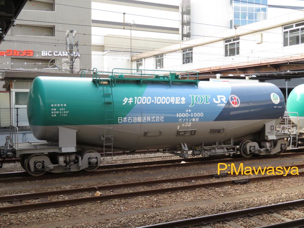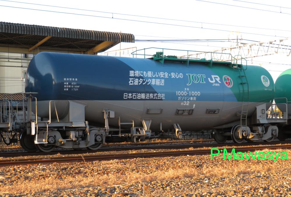 記念すべき1000号車が令和3年に登場。記念車輛として、特別装飾が施されました。タンク体下部は日本石油輸送所有車の灰色ですが、前位側より日本石油輸送の緑色、JR貨物のコンテナブルー、日本オイルターミナルの青15号がストライプ状に配されています。
