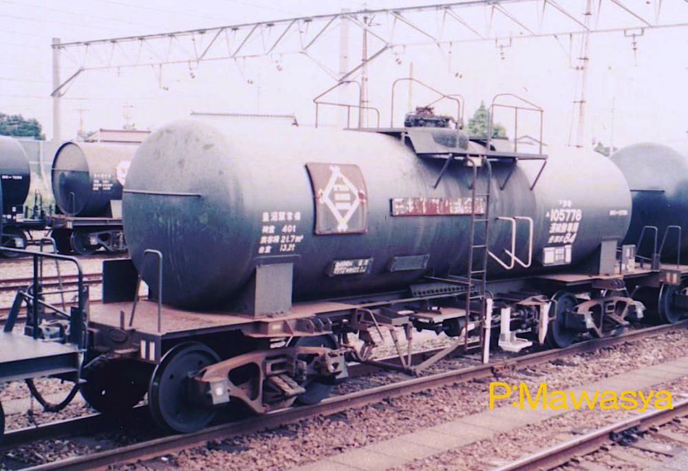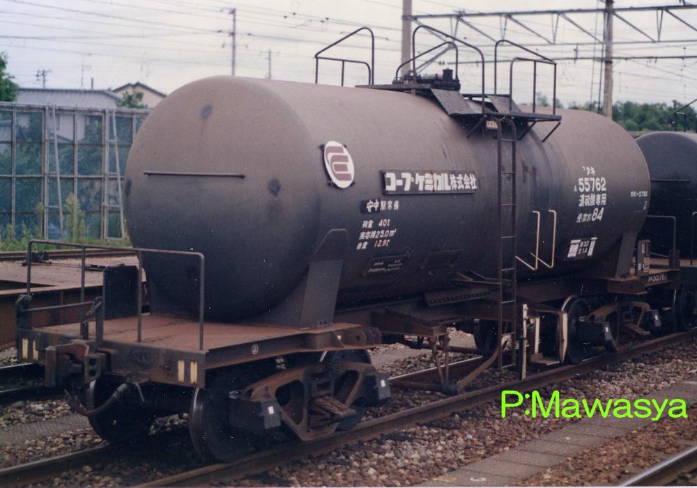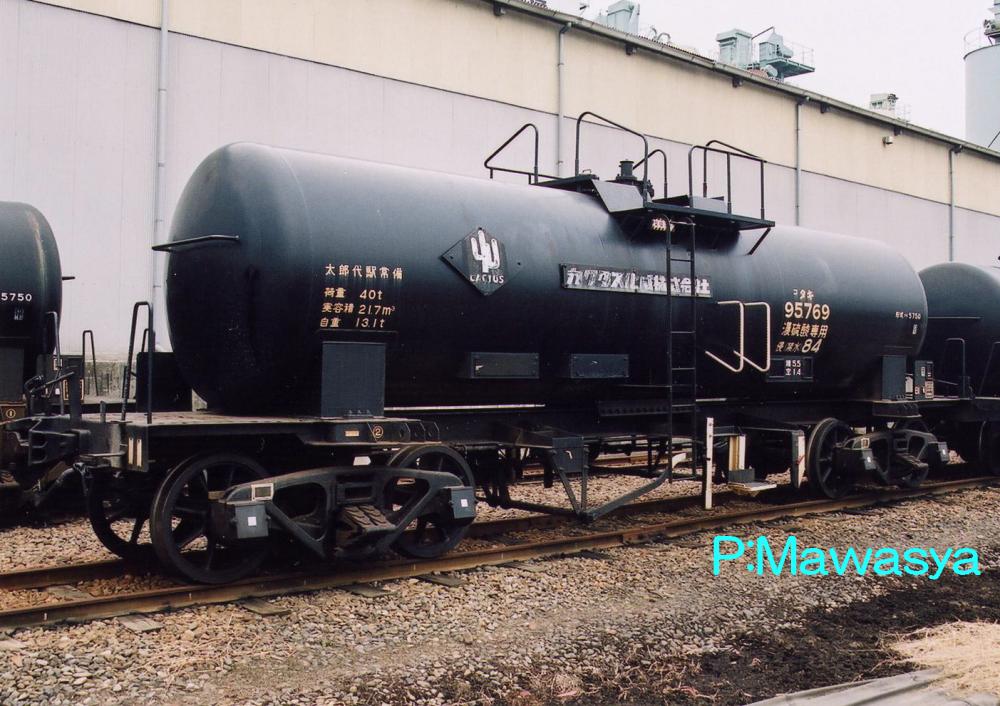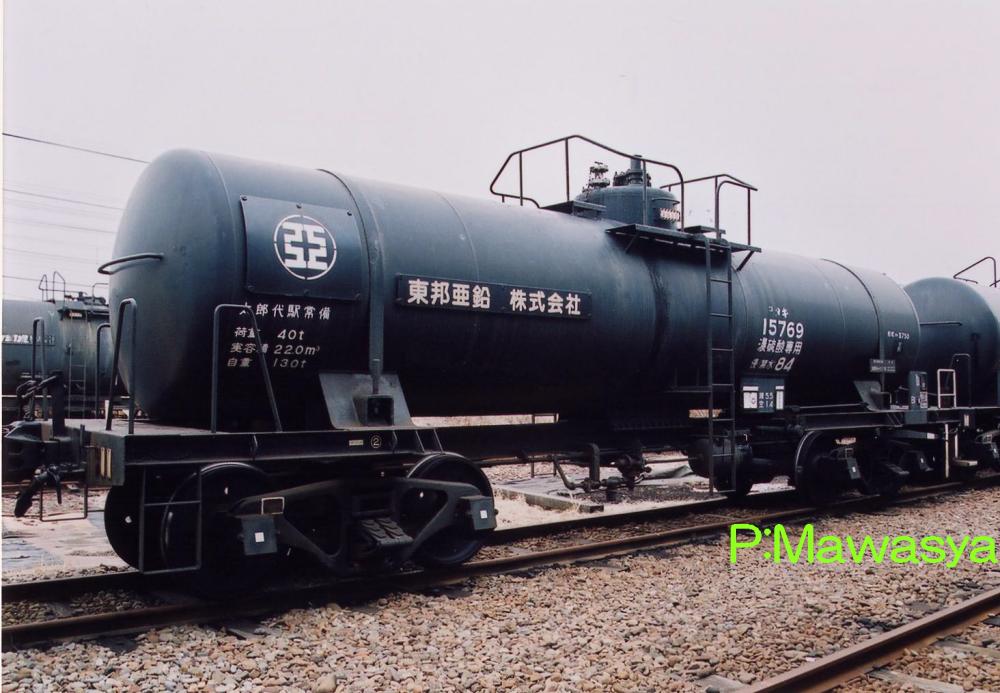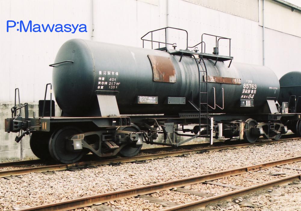 昭和43年に登場したタキ55761~63番の3両です。鉛室法という製法で生産された(現在は別の方法に変わっています。)低比重の硫酸を輸送する為に製作されました。比重の関係からタンク体直径が太くなり、変形車として有名になりました。タンク体の長さが短く、台枠に余裕があるのがお解り頂けると思います。