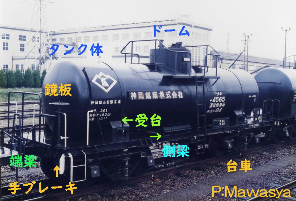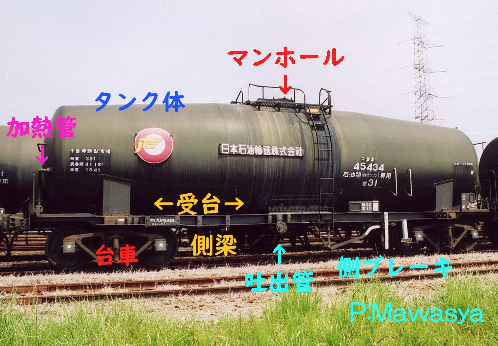 タンク車の基本的な名称は写真の通りです。少し、専門的な用語が多いですが、貨車を知るには避けて通れません。
