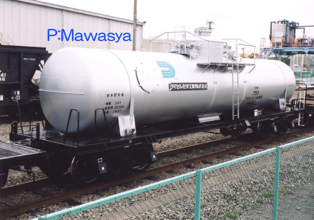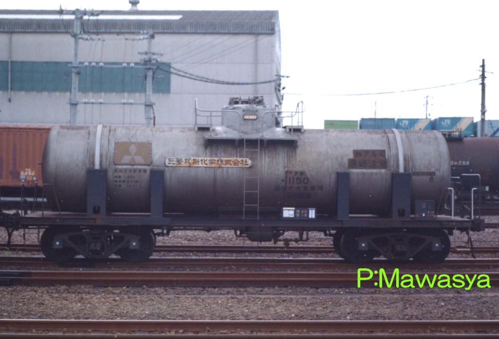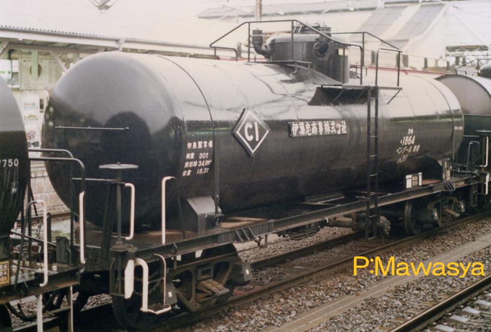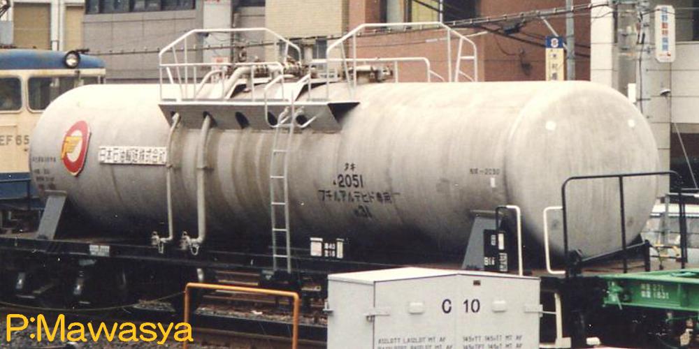 昭和39年に1両が製作されたプロピオン酸専用車です。全長が12mを超えているのにもかかわらず、車体長12m以下を意味する「コ」の特殊標記符号が付けられているのが特徴です。タンク体は腐食性のある積荷である為、ステンレス製となっています。写真は車体に沿って設置されていた液出管と空気管が撤去された晩年の姿です。平成19年に形式消滅しています。