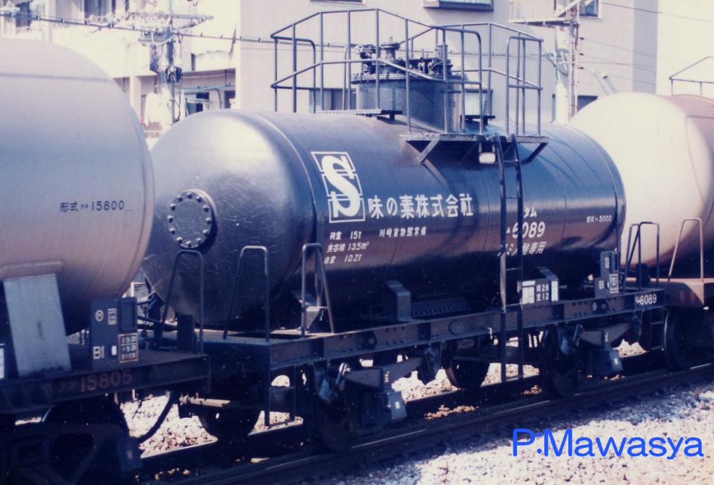 アミノ酸専用車の例。ファンからは所有する会社の頭文字「味」と形式の「タム」を組み合わせた「味タム」と呼んでいました。また、所有していた殆どの車輛が、小さな受台片側4個とマンホールを囲むしっかりとした手摺りが特徴でした。