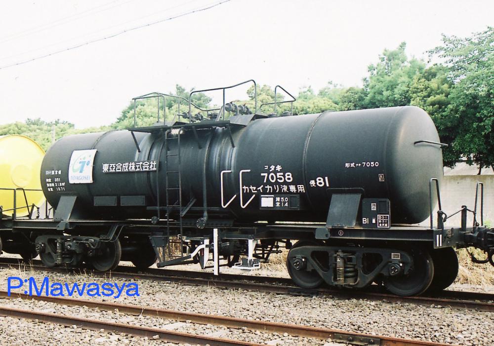 タキ7052~58番のグループ。タキ7050、7051番をドームレスタンク体にした姿で、ステンレス製タンク体に4本の補強環があるのが特徴です。53番のみ平型台枠で、他は側梁省略となっていました。晩年は一部の車輛で、苛性カリ液専用に変更しています。台車もTR225形式に履き替えています。