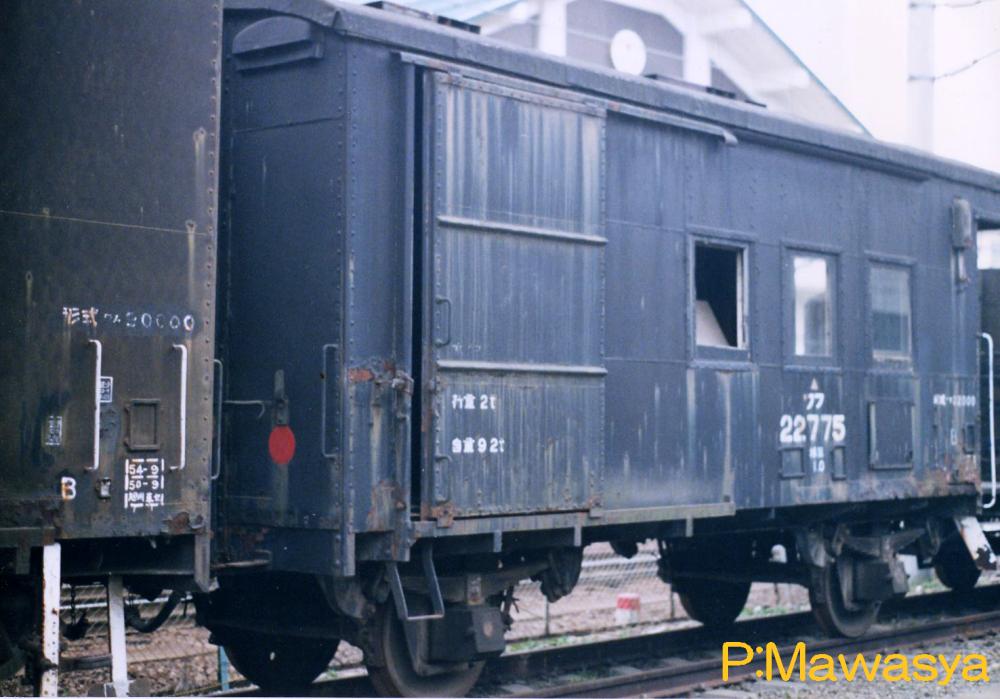 この形式も当初は電灯、ストーブは設置されておらず、昭和38年に車軸発電機、蓄電池、電灯、ストーブを設置しグレートアップしました。昭和43年ヨンサントウでは、一段リンク式を二段リンク式に変更し、スピードアップを図った一方、未改造車はワフ122000形式に変更されています。
