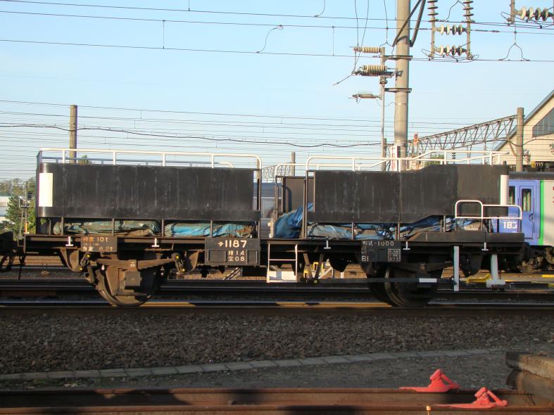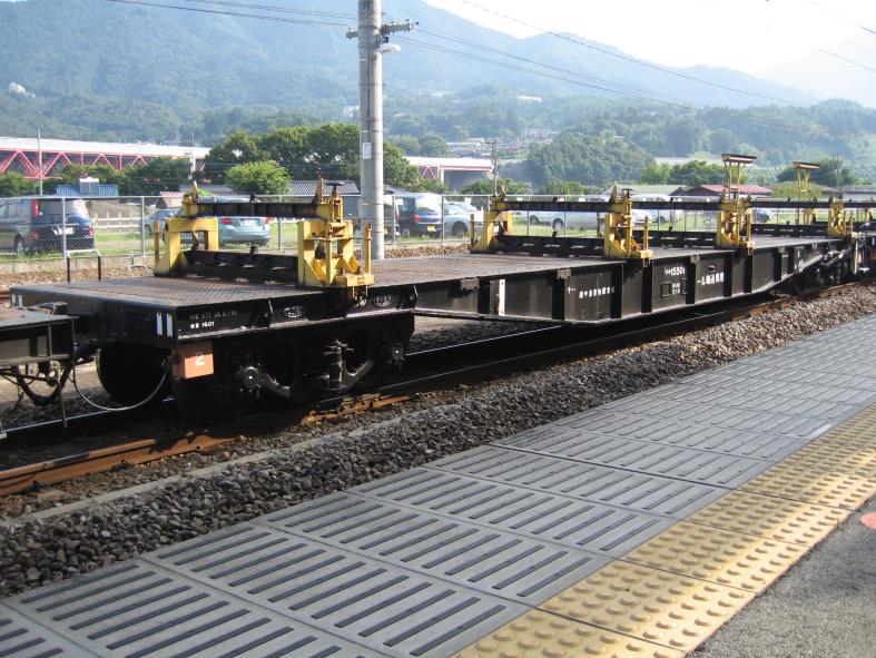 無蓋車に収まらない軽量の嵩高貨物、長尺物輸送時の遊車(ゆうしゃ)を目的に昭和32年より戦前製の無蓋車を200両改造して登場した形式です。改造車と言っても、種車の部材の一部を流用しただけで、台枠や床材など多くが新しく製作されています。外観は華奢な感じですが、二段リンク式で運転最高速度は75km/hとなっています。