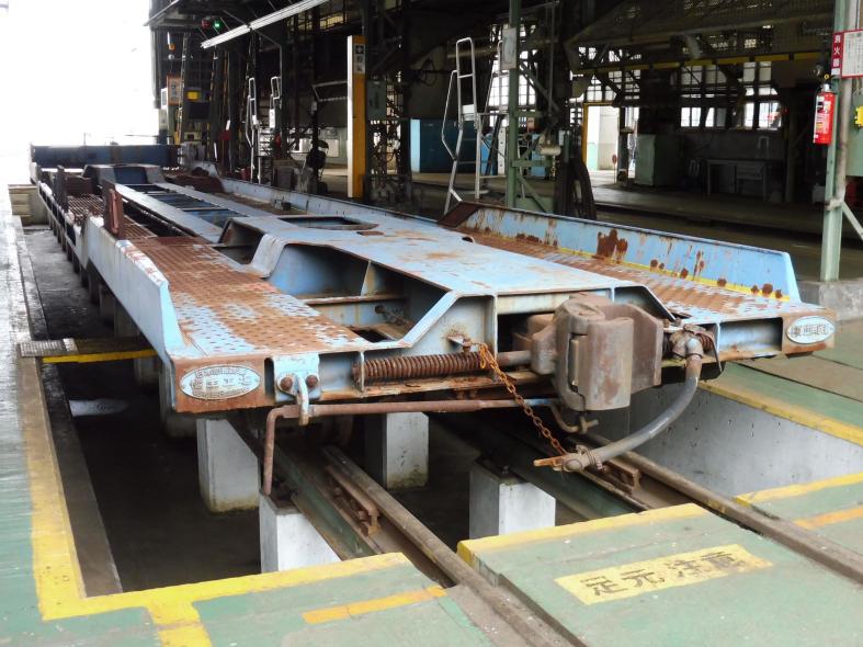 昭和58年に開発が再開されます。この時、クラ9000形式を改造します。と言っても、車体を新製して、履いてTR901形式台車を再利用する内容です。こうして、チサ9000形式が登場しました。実質的に車運車なのですが、長物車として登録されています。車体は青15号(インクブルー)としています。台車の改良や車体を全体的に低床化した構造となっており、荷役はトラックがランプウェイから自走をして行います。台車部分が中間部よりも高くなっていますが、問題のない構造となっています。