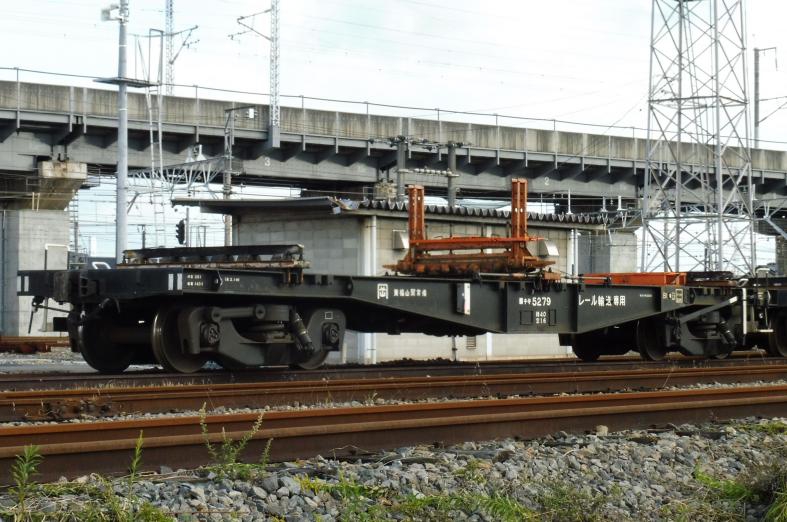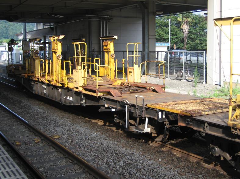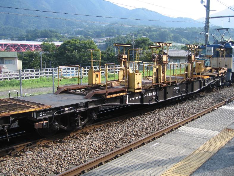 北海道新幹線建設の際、津軽海峡線区間に新幹線軌条の敷設、交換など新幹線に対応する工事を行うためのロングレール輸送用貨車の一形式で、平成20年にコキ50000形式350000番代車を種車に2両改造されました。改造内容はコンテナ車をロングレール輸送用に改造するもので、必要な機材などを搭載しました。