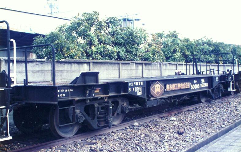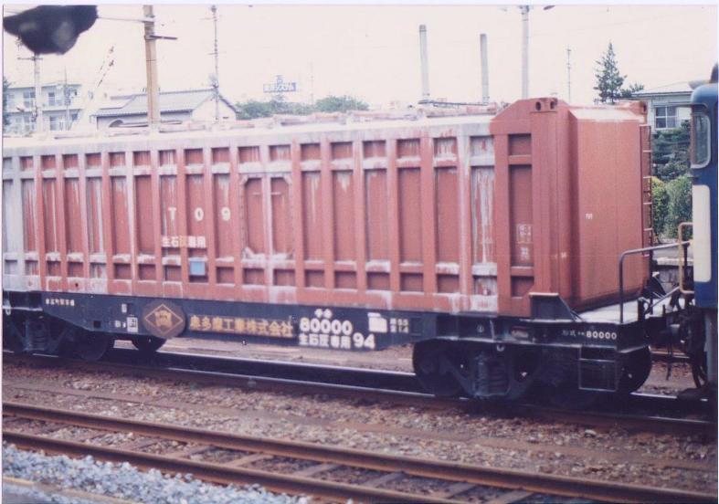 昭和51年より44両が製作された生石灰コンテナを輸送する私有長物車です。ホッパ車で生石灰を輸送していた製鉄所が移転し、最寄り駅までを鉄道、そこから道路輸送で輸送する方法になったため、専用のコンテナが用意され、それを積載する本形式が製作されました。チキ80000は先行試作車で、以降量産車となります。
