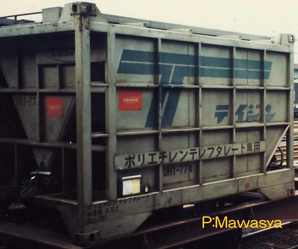 昭和46年に登場した私有ホッパーコンテナの第1号形式です。国鉄所有のH10形式の増備形式にあたり、普通品(非危険品)用となります。(危険品用としてUH3形式というものがありました。)ビニル系樹脂を専用とするコンテナを中心に800個以上が製作されました。