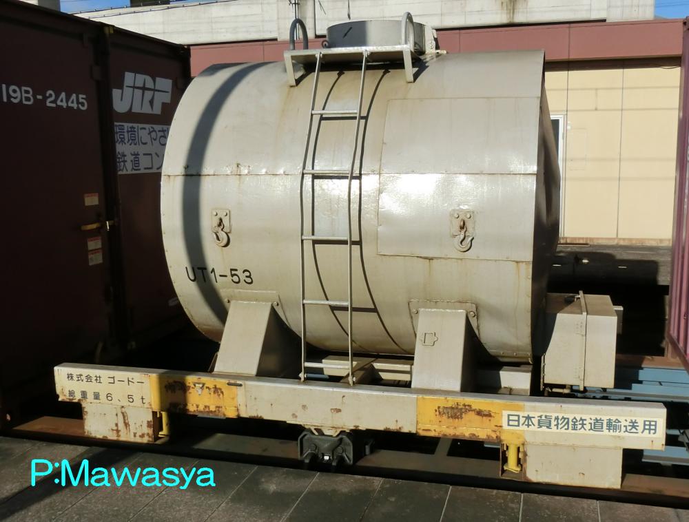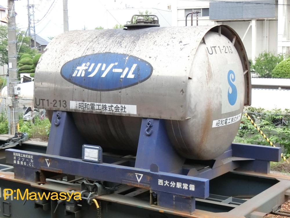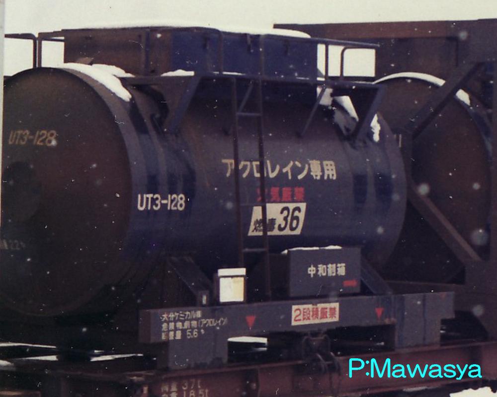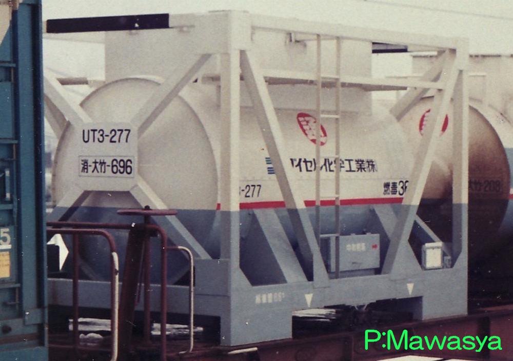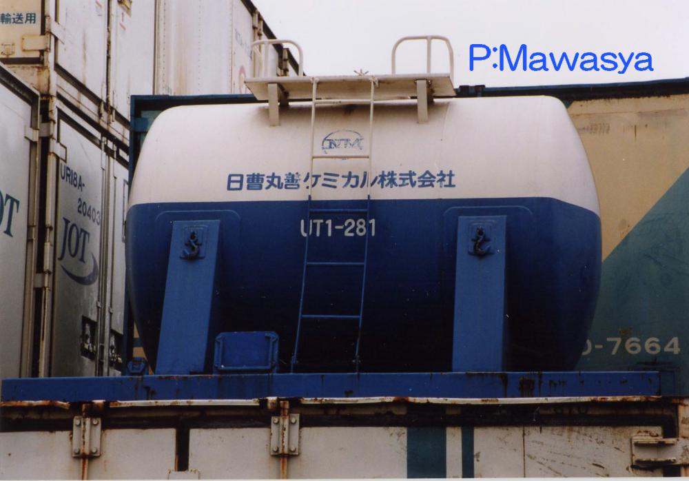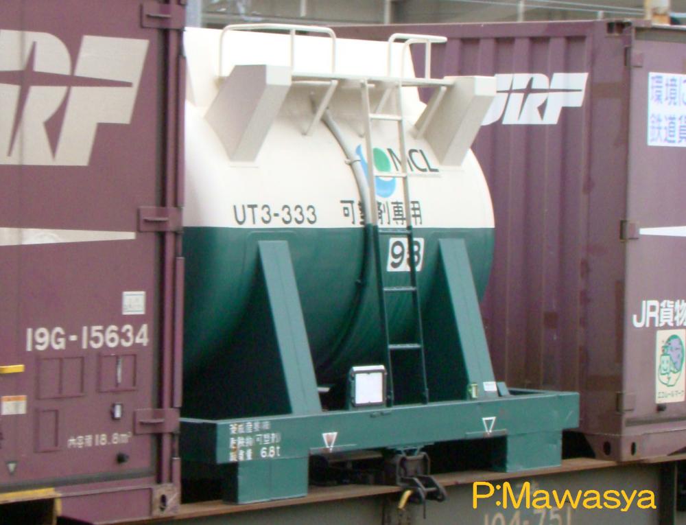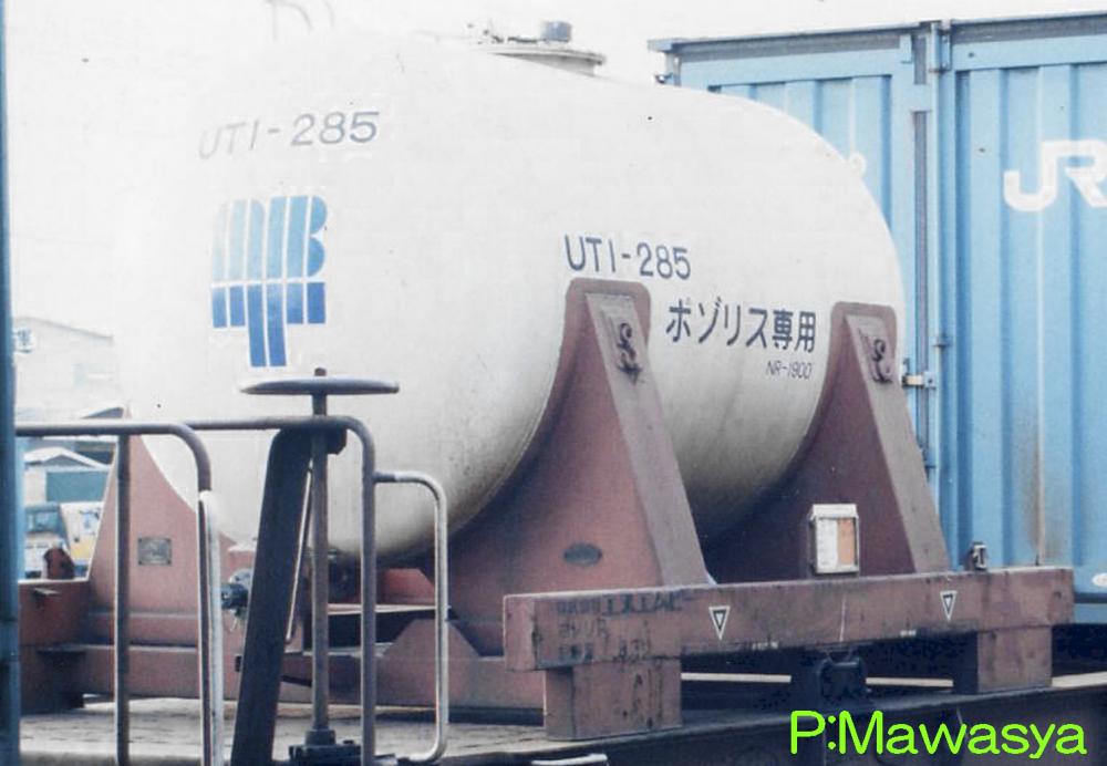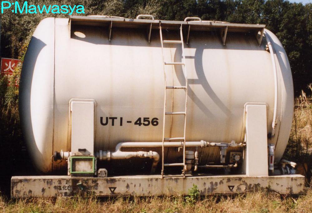 UT1形式と同じく昭和45年に登場した私有タンクコンテナです。UT1形式が普通品(非危険品)であるのに対し、本形式は危険品を積荷としたもので、外観上は似たものも多くあります。一つの違いとして、化成品分類番号が表記されています。危険品なため、経年劣化、耐久年数の関係から多くが消滅し、登録も既に終了している事から、形式消滅も近いようです。