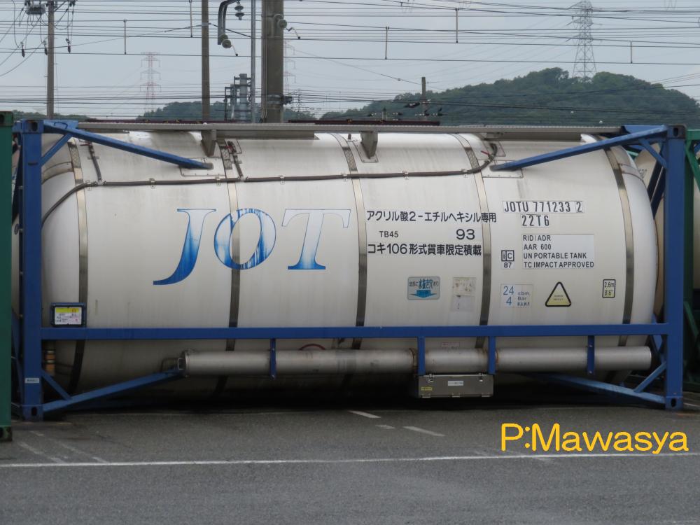 アクリル酸2-エチルヘキシル専用の24kLのコンテナです。化成品分類番号は93。仕様コード(ISO6346)は22Т6(長さは20fで高さが2591mm、積荷は危険物液体)となっています。「コキ106系形式貨車限定積載」の表記となっています。