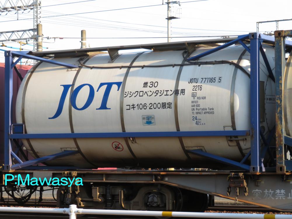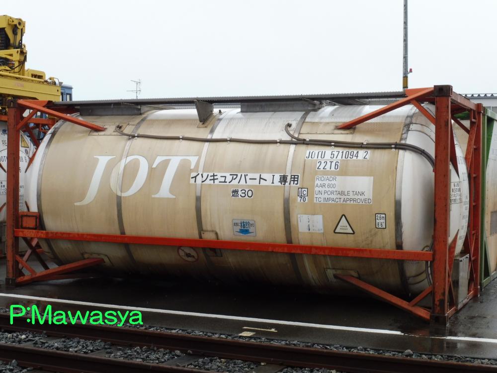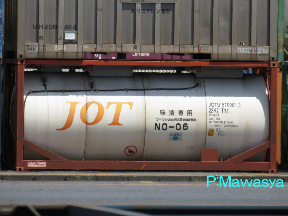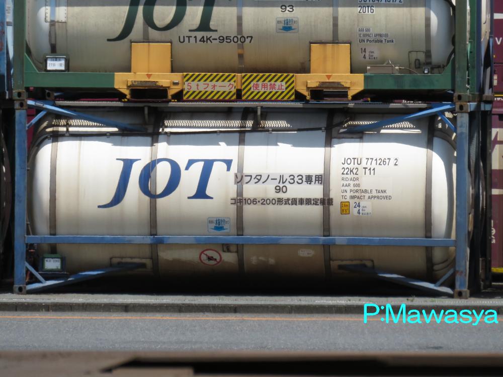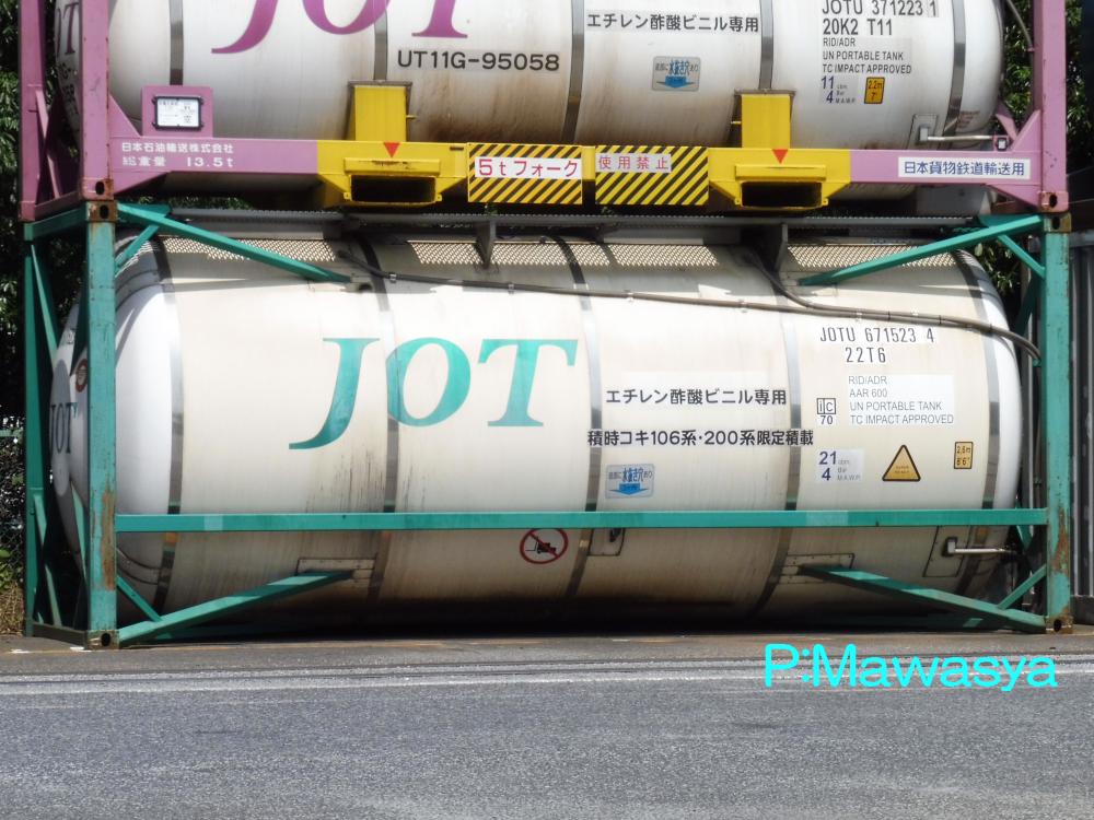 ジシクロペンタジエン専用の21kLコンテナ。両方とも同じタイプに見えますが、左は「コキ106形式貨車限定積載」と貨車の指定ですが、右は「積時コキ106・200系限定」と積載時に指定する文言となっている他、仕様コード(ISO6346)が左は22K2であるのに対し、右は22Т6と異なる。圧力容器仕様のコンテナである為なのかな?同一種別であっても、異なる仕様コードがある。海上コンテナの世界は奥が深いですね。