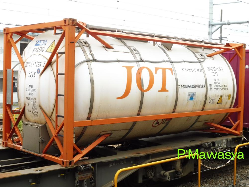 グリセリン専用の17.5kLコンテナ。一見するとフレビータイプですが、上部にも補強梁が入っている珍しい個体。「コキ106系形式貨車限定積載」と書かれています。仕様コード(ISO6346)は22Т6となっています。