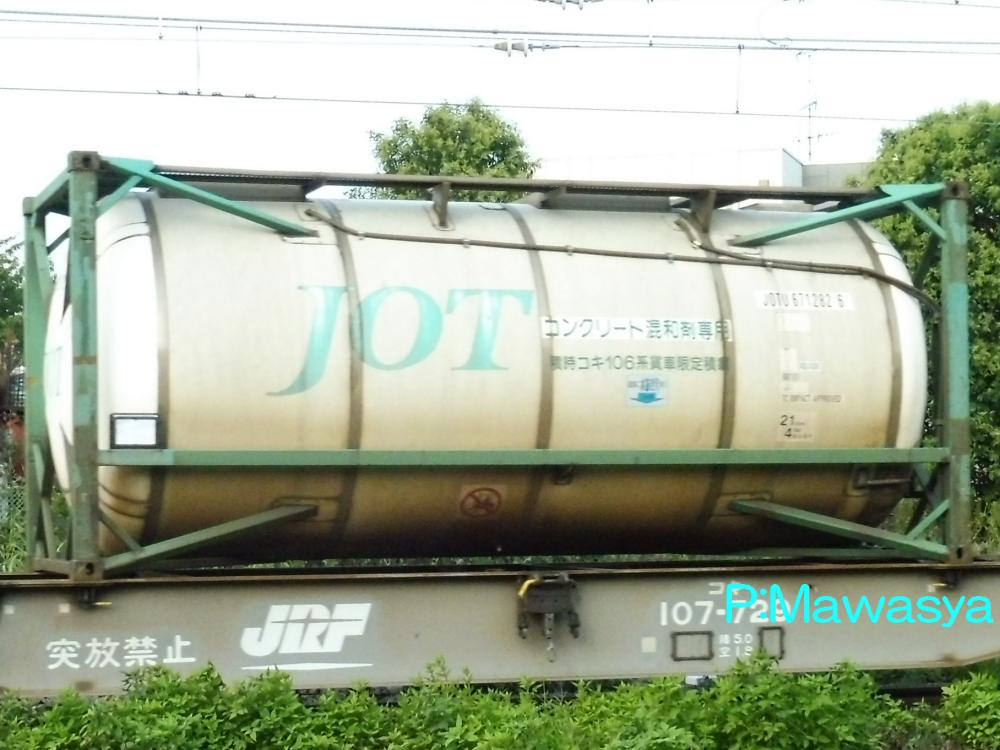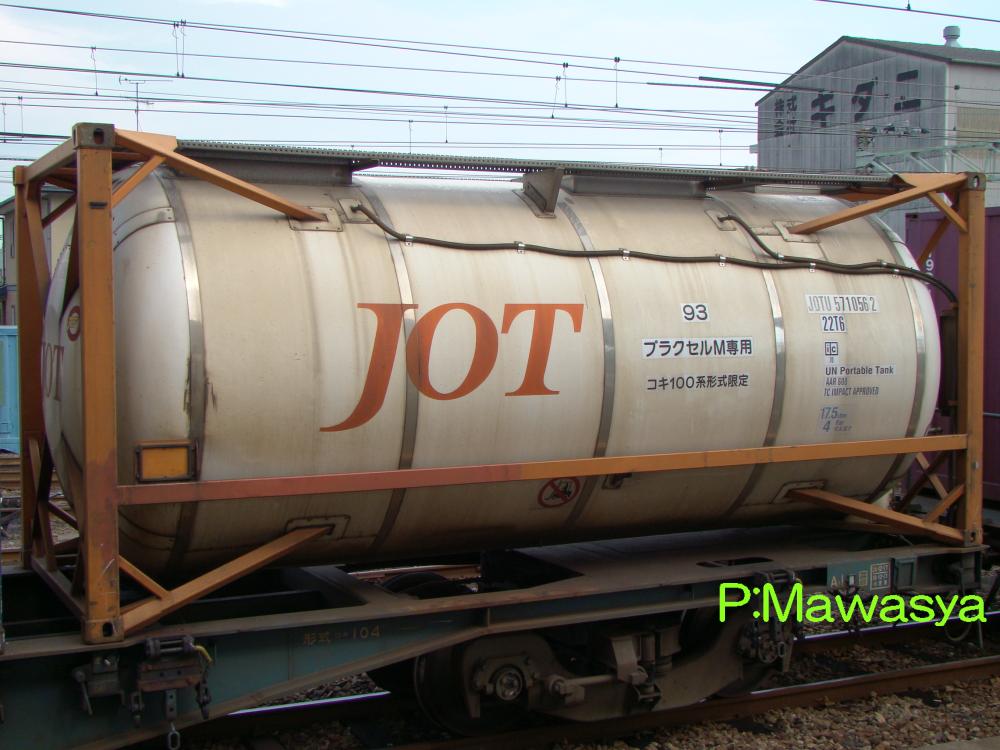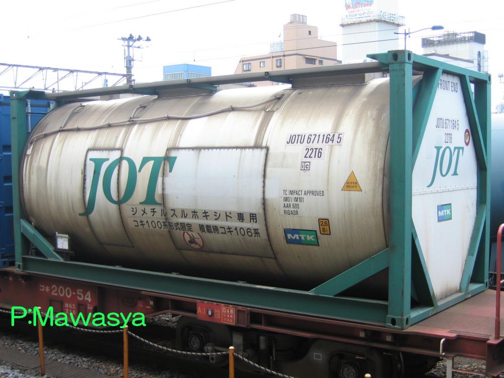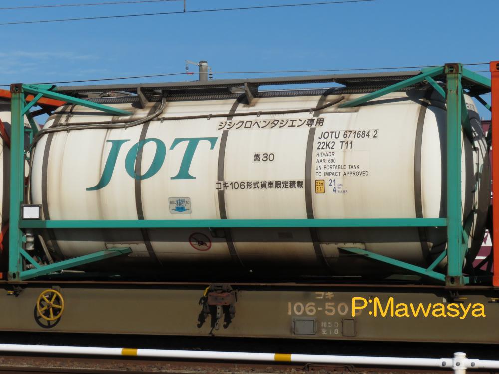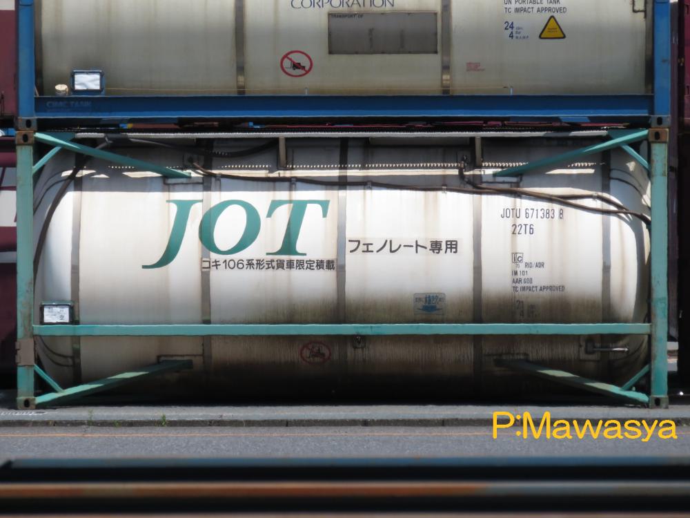 ジメチルスルホキシド専用の21kLコンテナ。フレームタイプなのですが、上の梁が無い珍しいタイプです。よく見ると梁を何かの事情で撤去したようにも見える。注意表示も「コキ100系形式限定 積載時コキ106系」とこれも珍しい表記となっています。