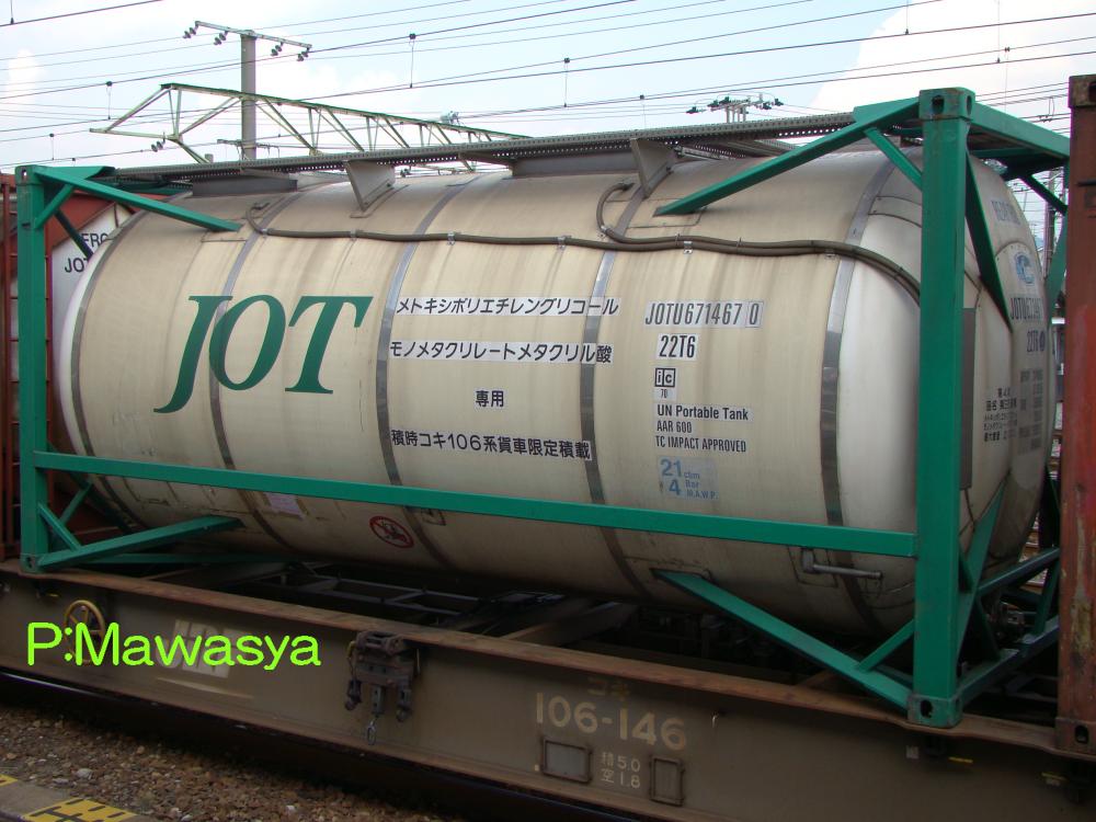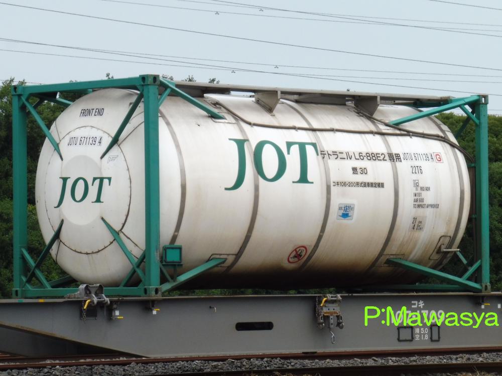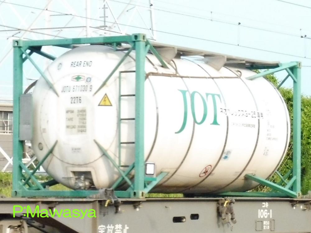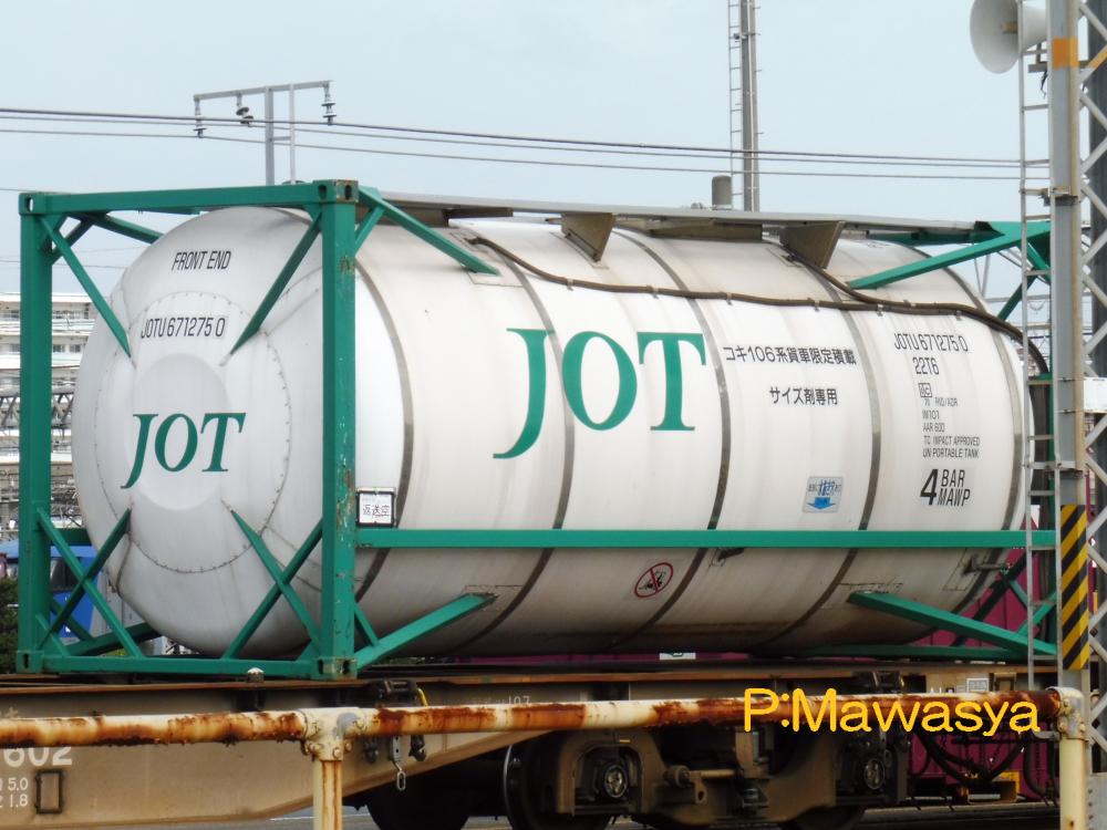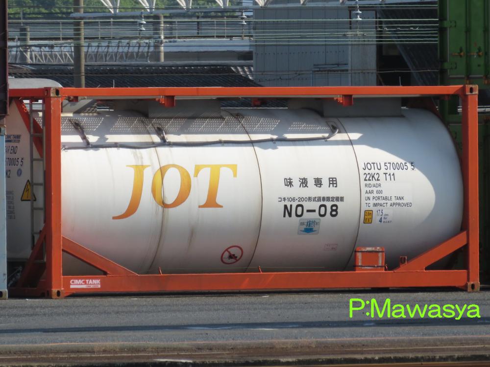 ジメチルスルホキシド専用の21kLコンテナ。フレームタイプなのですが、上の梁が無い珍しいタイプです。よく見ると梁を何かの事情で撤去したようにも見える。注意表示も「コキ100系形式限定 積載時コキ106系」とこれも珍しい表記となっています。