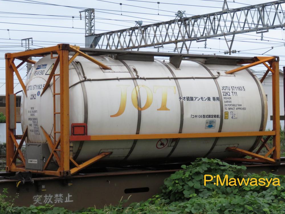 チオ硫酸アンモン液専用の17.5kLコンテナです。積載注意書きが「コキ106型式限定積載」と「」書きであるのが面白い。
