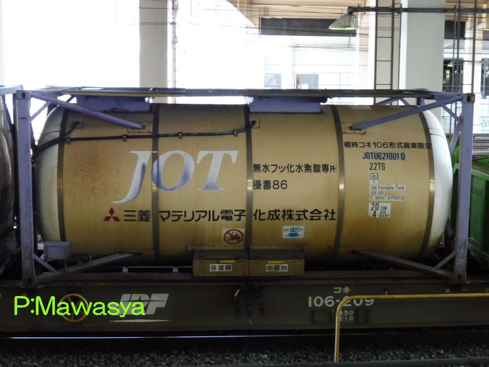 無水フッ化水素酸専用の11kLのタンクコンテナ。三菱マテリアル電子化成(株)が借受会社となっています。化成品分類番号は侵毒86。仕様コード(ISO6346)は22Т6となっています。