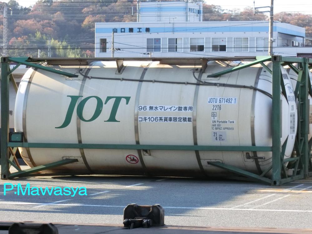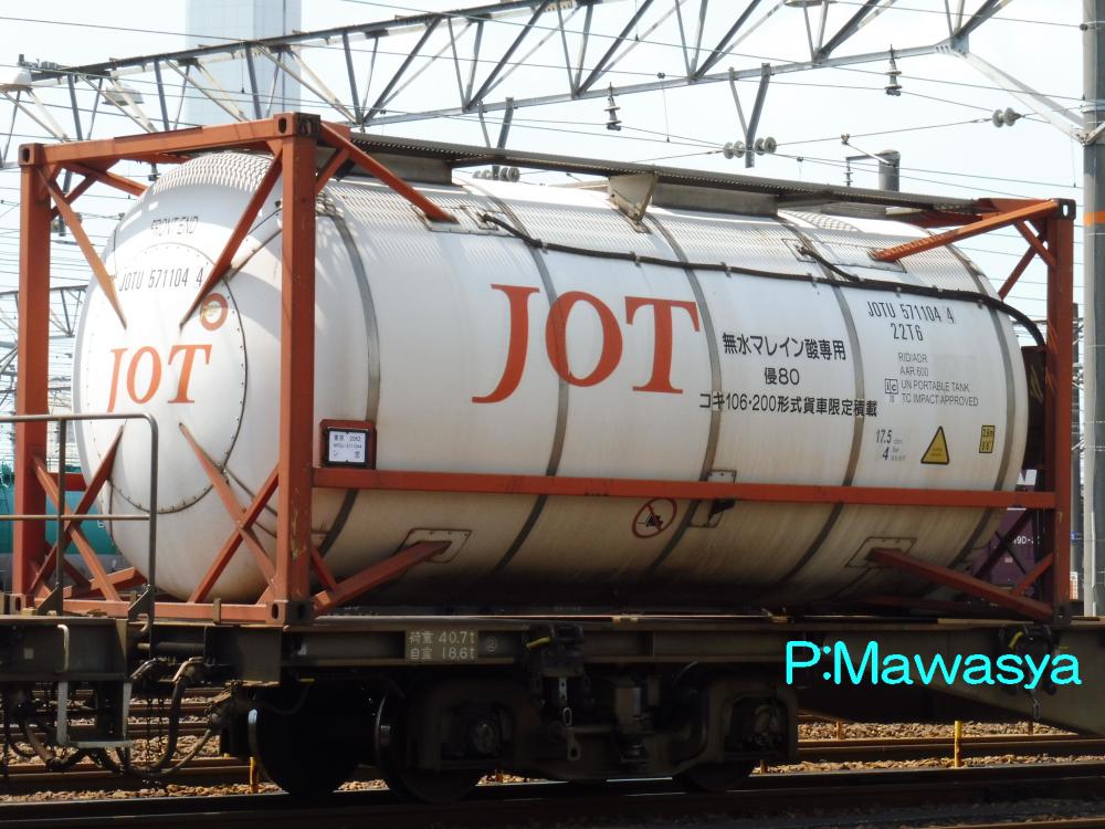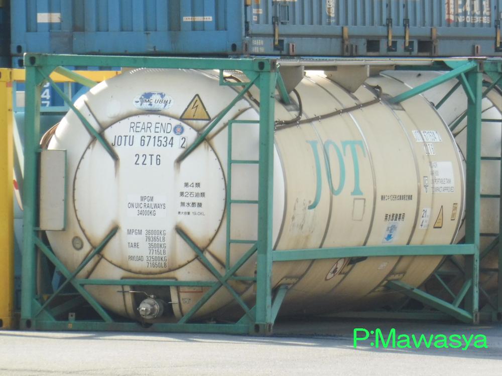 一回り大きい21kLコンテナ。化成品分類番号が17.5kLコンテナとは異なり、96となっています。無水マレイン酸は水やアルコール、クロロホルム等に溶かして輸送するので、それによって危険性などが変化するのでしょう。
