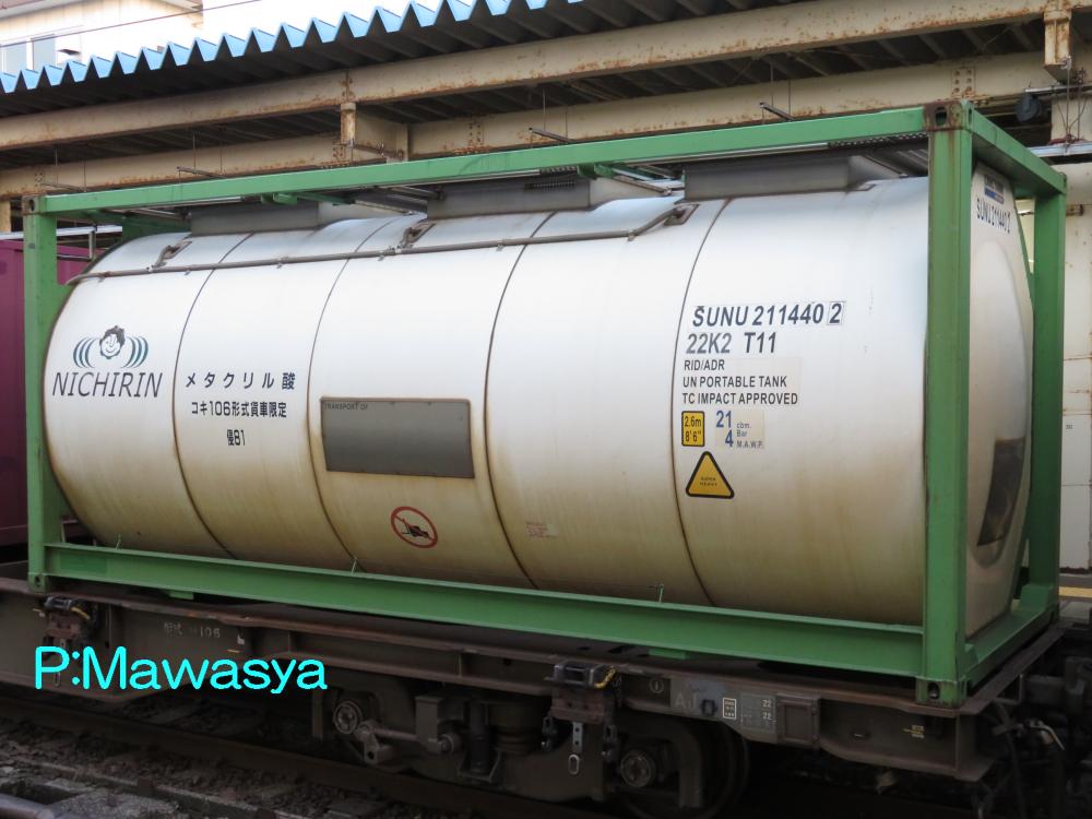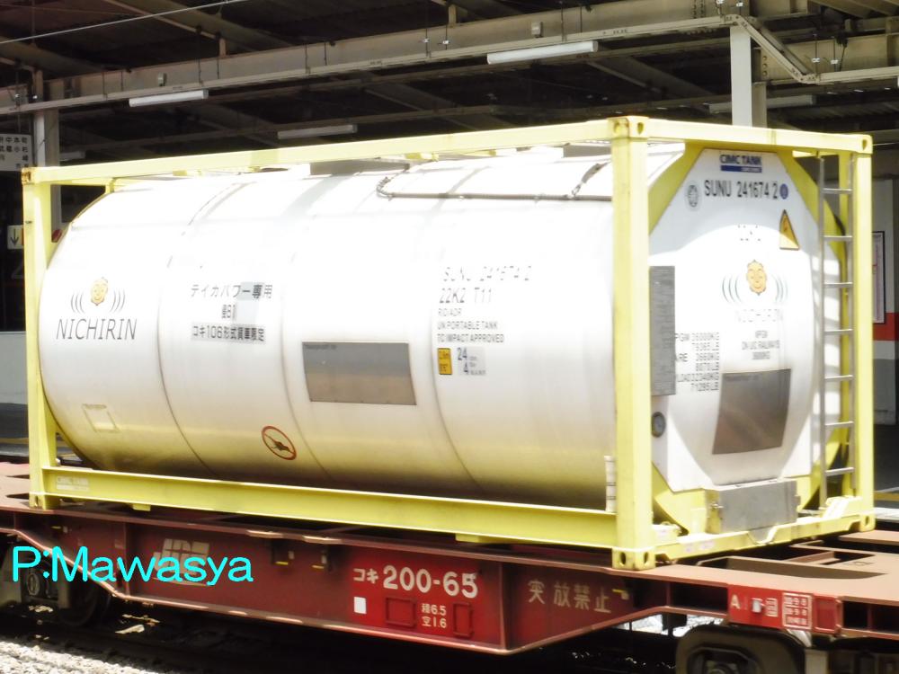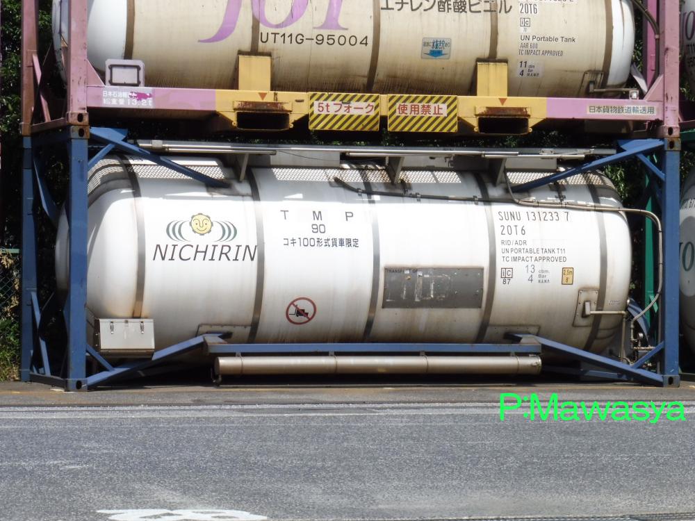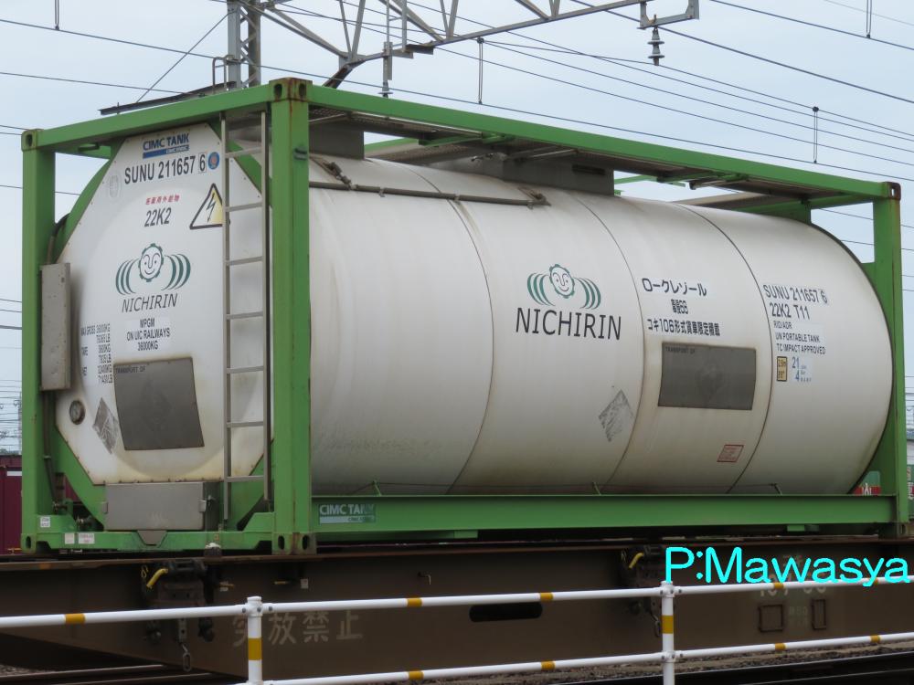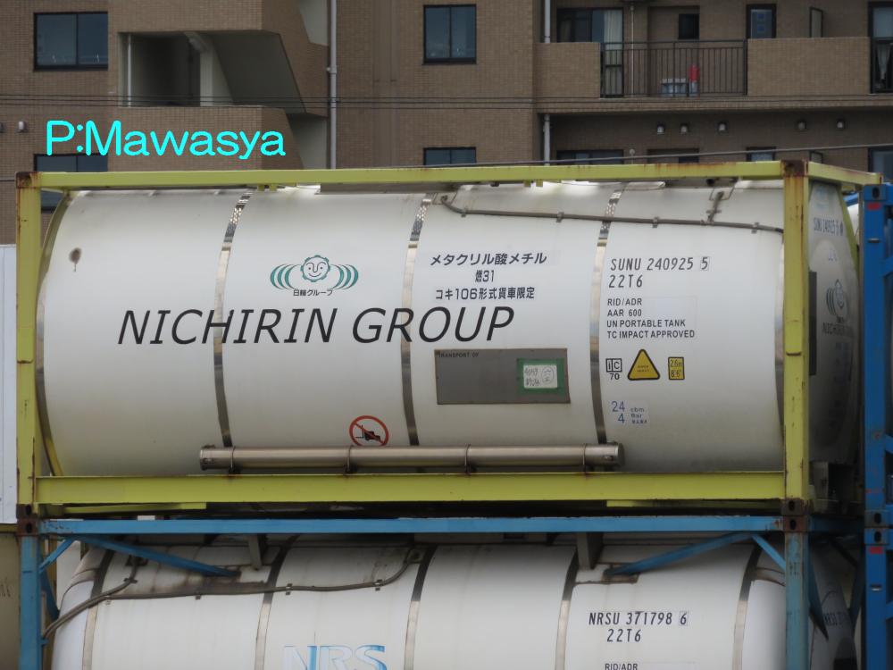 フェノール専用の21kLコンテナ。国連番号が書かれていますが、これは国連経済社会理事会に設置された危険物輸送専門委員会における、輸送上において危険性や有害性がある化学物質に与えられた番号で、国連の略称「UN」+4桁の数字で表しています。番号自体は制定された順番に通し番号になっており、意味はありませんが、積載物が化学物質であり、危険及び有害性がある事がわかります。化成品分類番号は毒61、仕様コード(ISO6346)は22K2となっています。