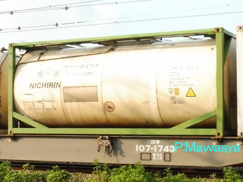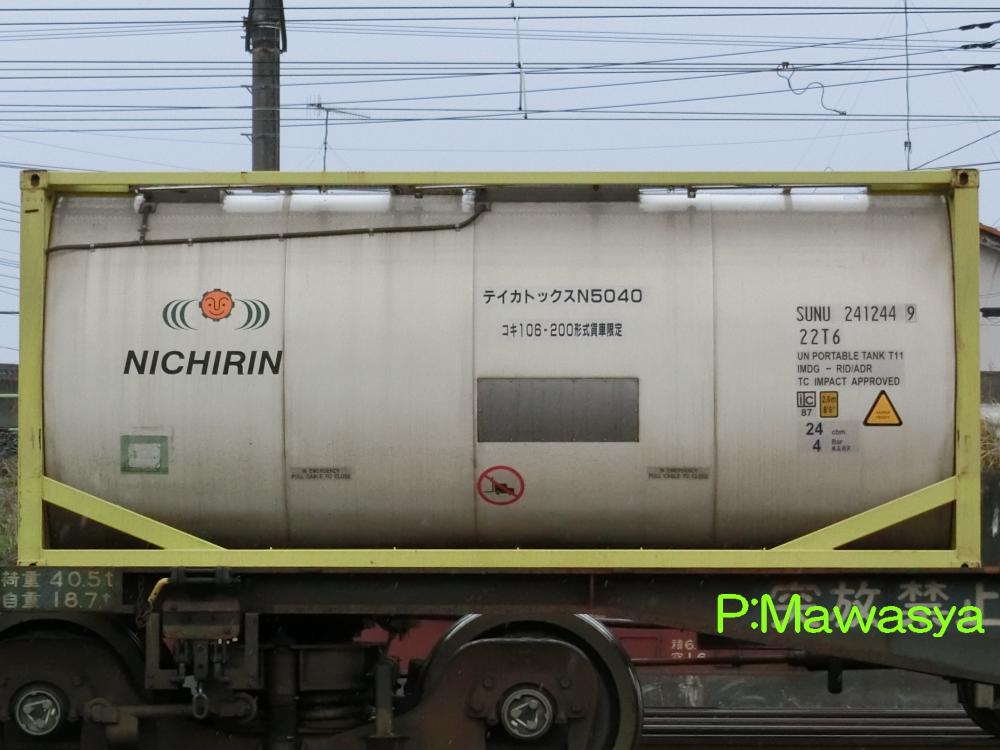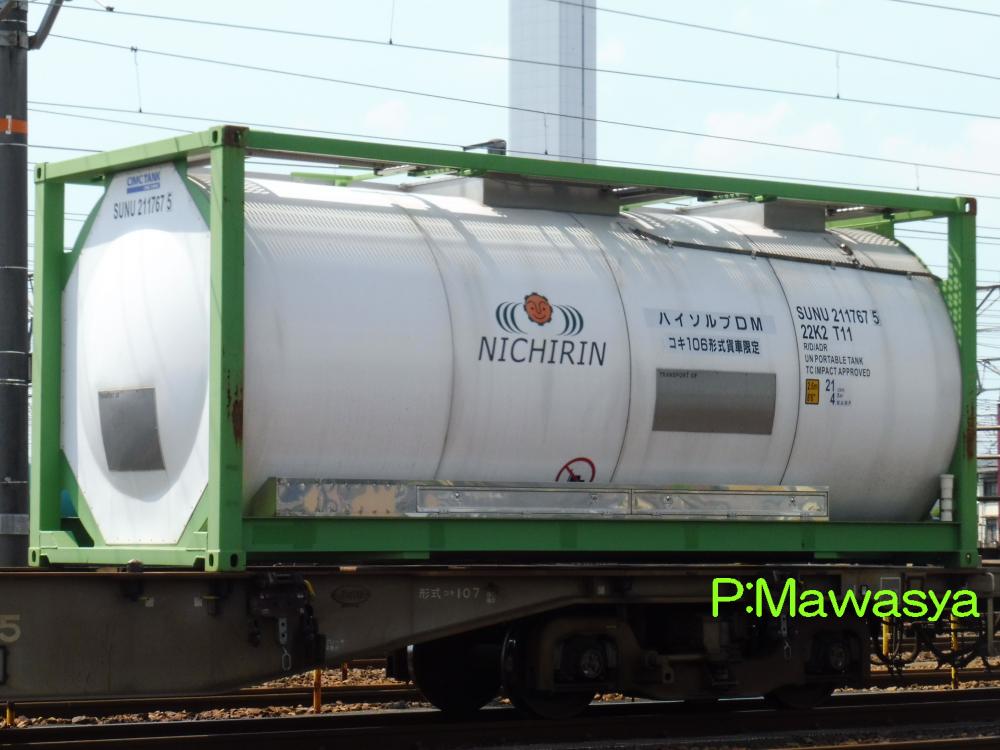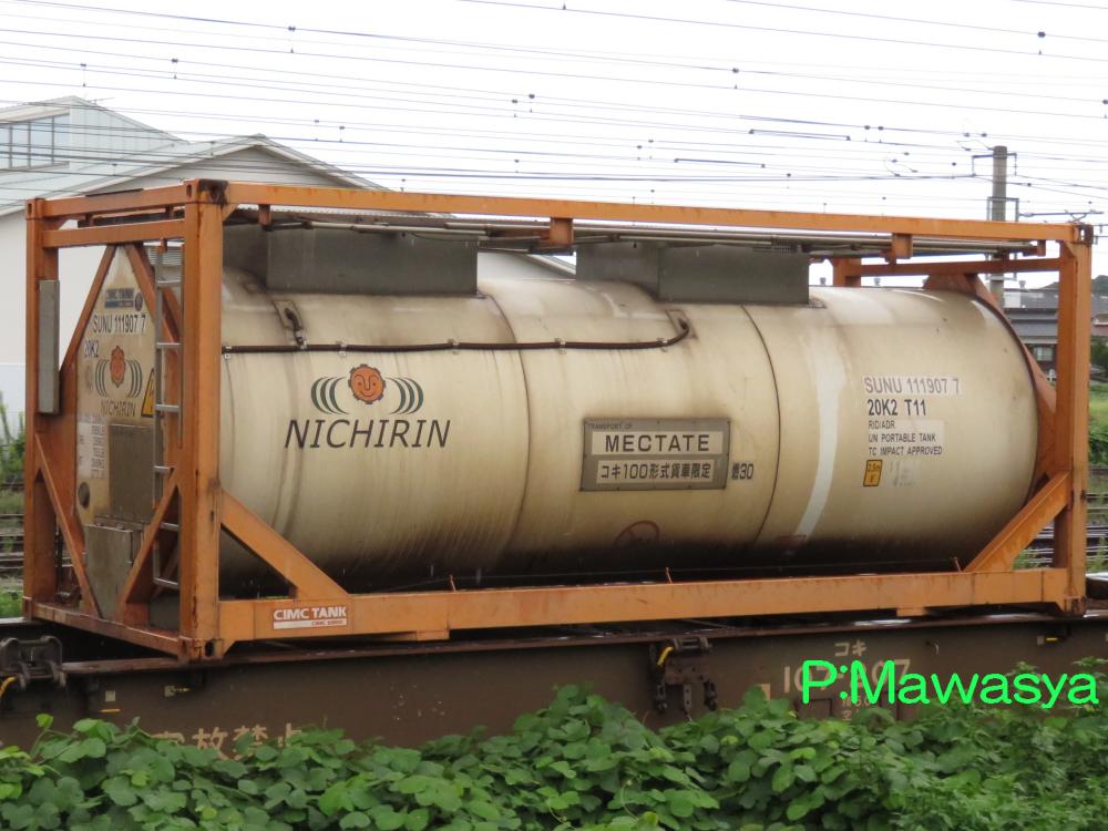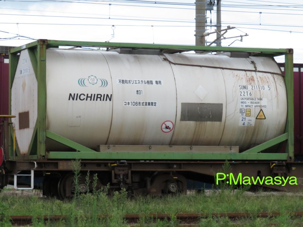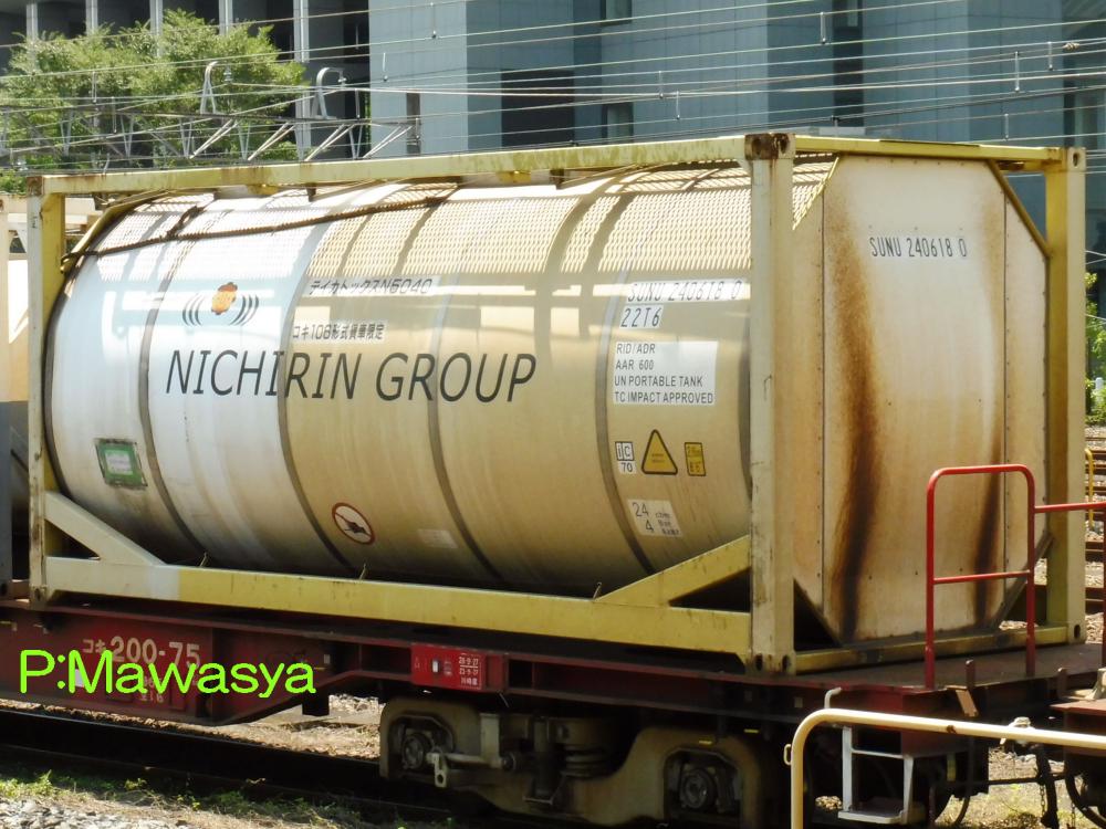 フェノール専用の21kLコンテナ。国連番号が書かれていますが、これは国連経済社会理事会に設置された危険物輸送専門委員会における、輸送上において危険性や有害性がある化学物質に与えられた番号で、国連の略称「UN」+4桁の数字で表しています。番号自体は制定された順番に通し番号になっており、意味はありませんが、積載物が化学物質であり、危険及び有害性がある事がわかります。化成品分類番号は毒61、仕様コード(ISO6346)は22K2となっています。